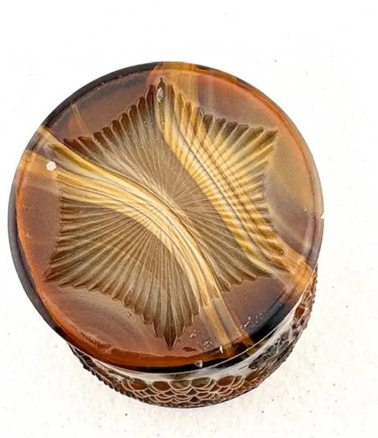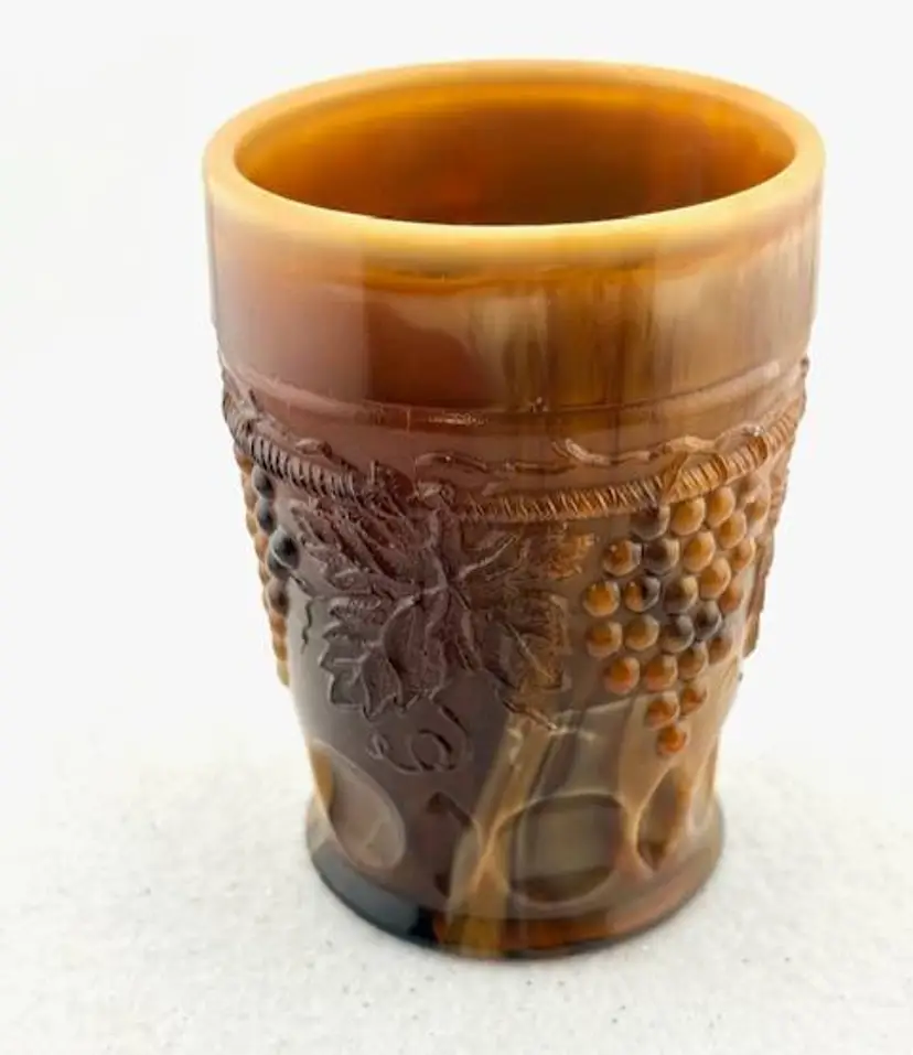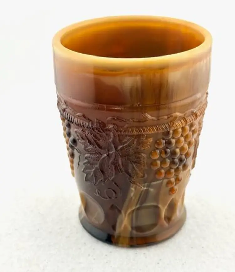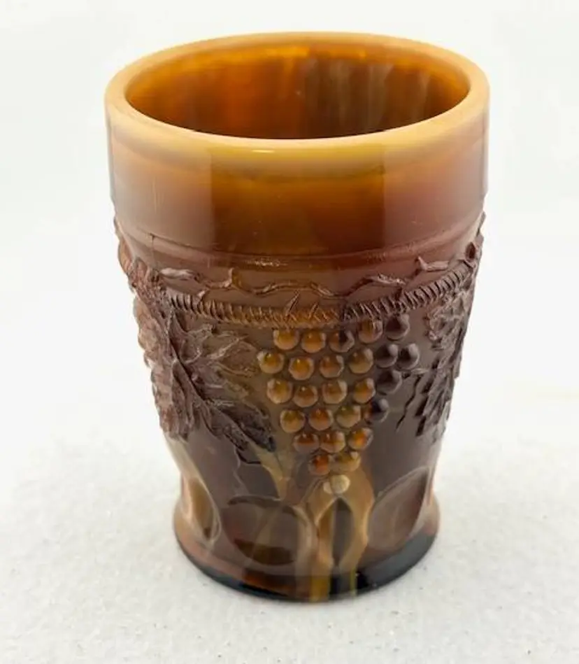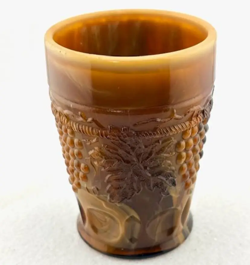 This is an amazing piece of chocolate slag glass made by Joe St. Clair. Look at the base with the stripes going across and in each stripe, it looks look a blue hue. On the inside are the initials of Joe St. Clair. It is in great condition with no chips or cracks. It measures 4" tall x 2.75" across at the rim.
