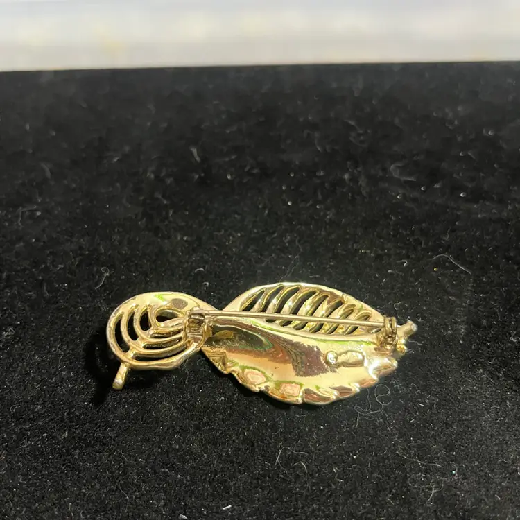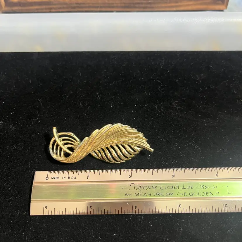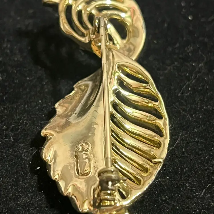 • Brand: Trifari (Signed with Crown Hallmark) • Period: Mid-Century Modern (Circa late 1950s – 1960s) • Material: Gold-Tone "Trifarium" Plating • Design: Ribbed Leaf / Stylized Feather • Closure: Secure roll-over safety clasp in excellent working order • Condition: Very Good Vintage Condition. The gold plating is exceptionally bright with minimal surface wear. The maker's mark is partially obscured by the original thick plating, which is common for this era's production.
