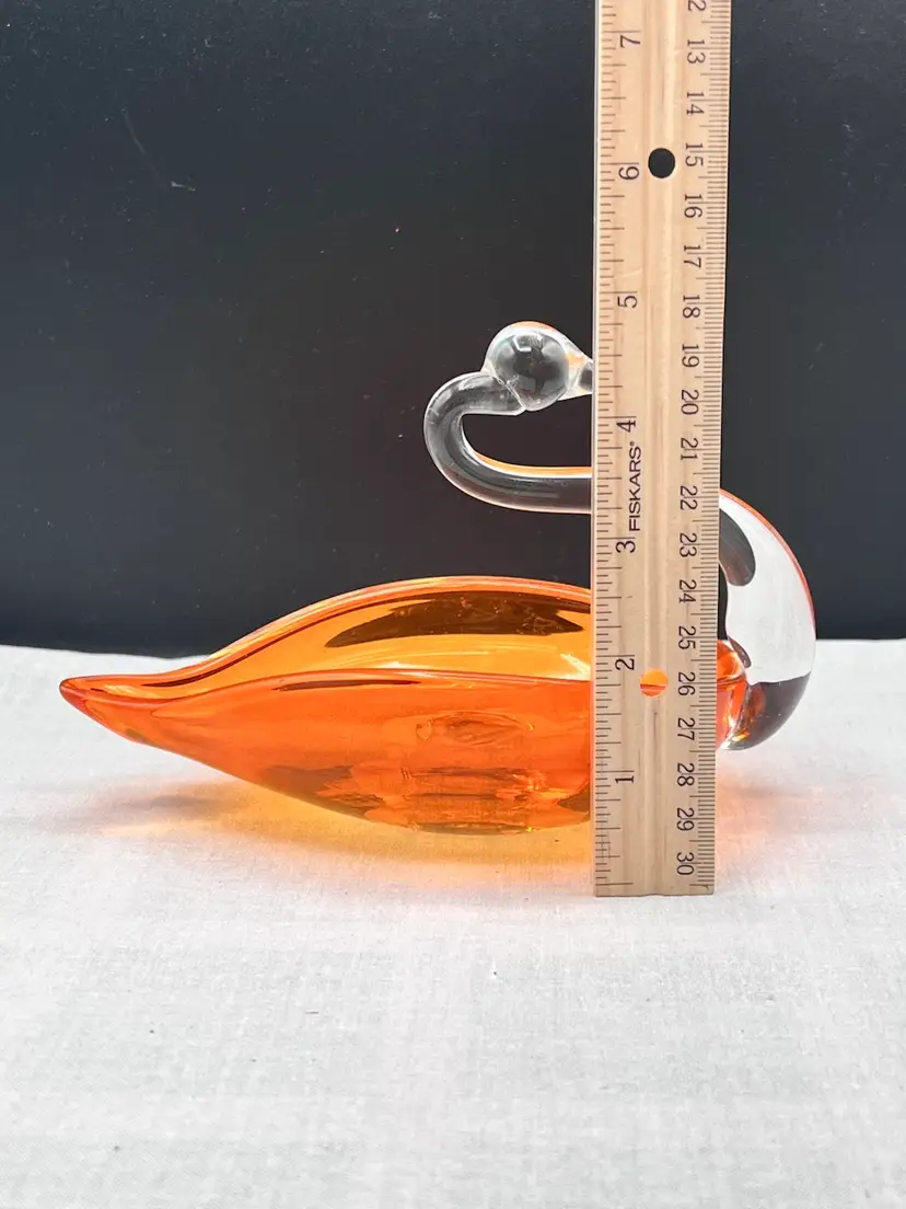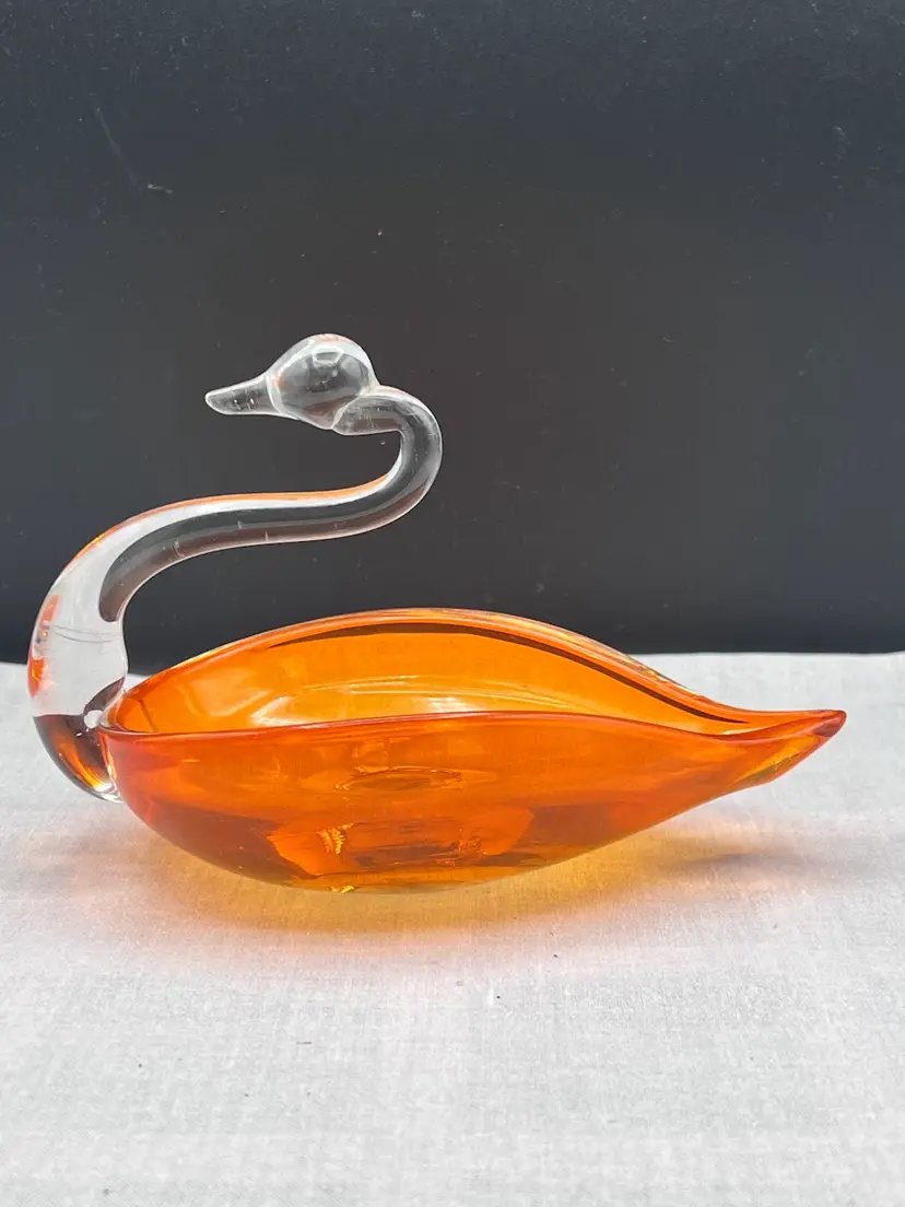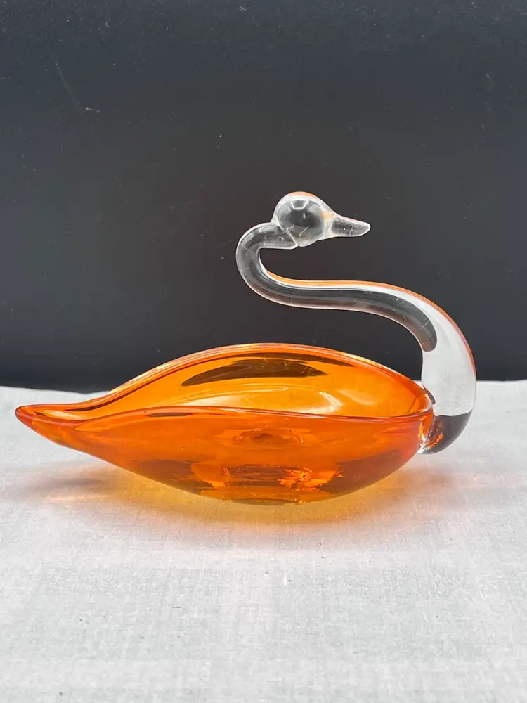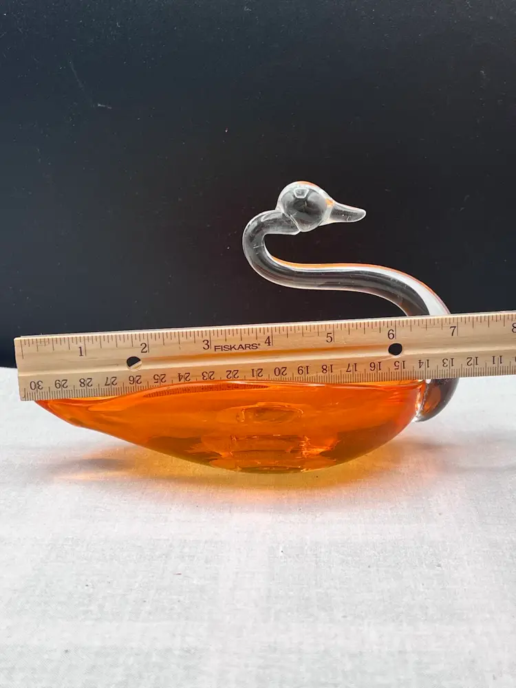 Beautiful Vintage Duncan & Miller Art Glass Swan Bowl/Candy Dish/Ash Tray Orange & Clear Piece is in very good vintage condition, no chips or cracks, there are a few minor surface scratches as noted in pictures Just under 5" tall x 7 1/4" wide