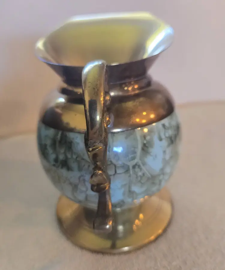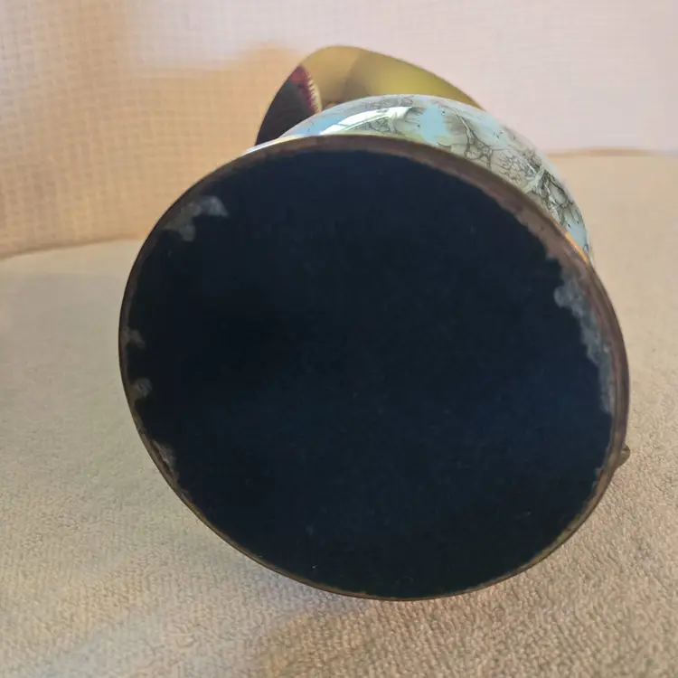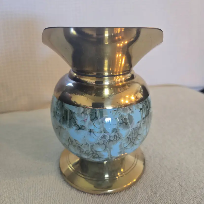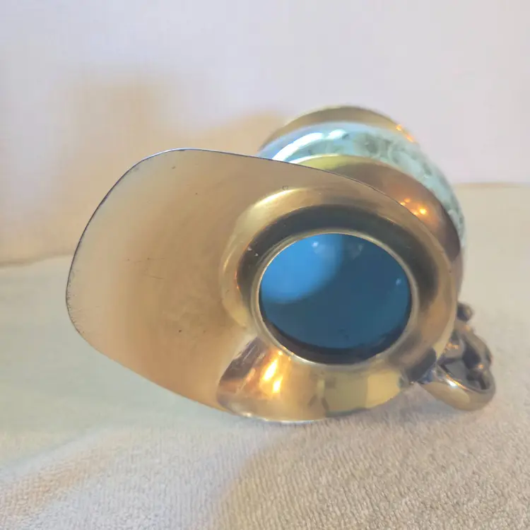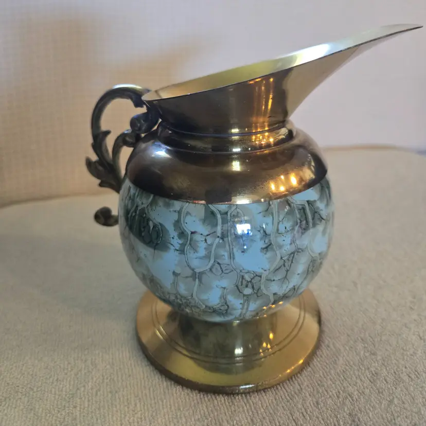 Approximately 6" tall and 6" wide. Beautiful turquoise ceramic middle with a solid brass base and spout with a very intricate handle. It has a felt bottom to protect furniture. Beautiful glossy finish.