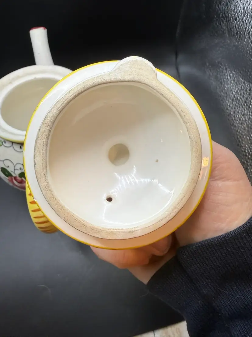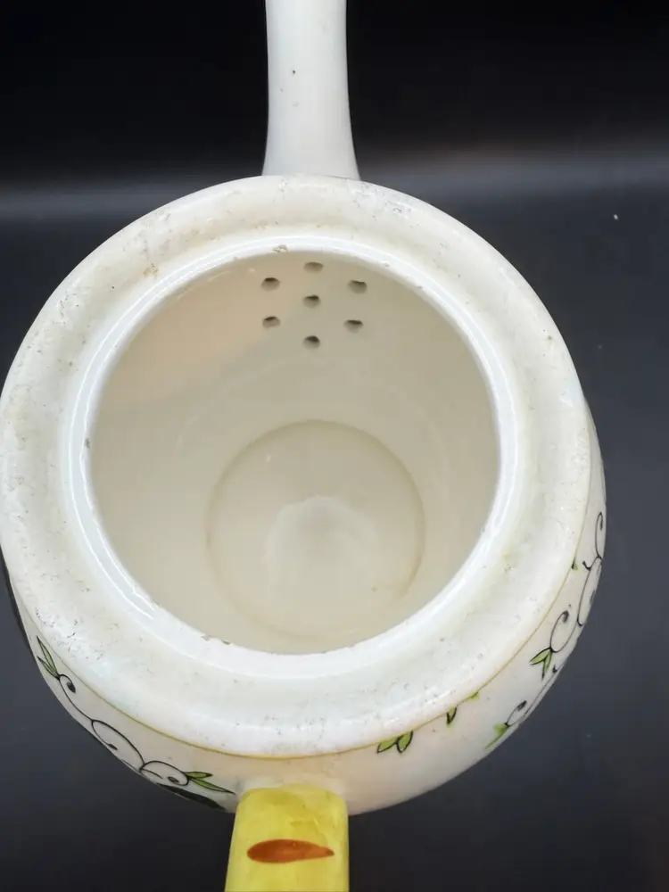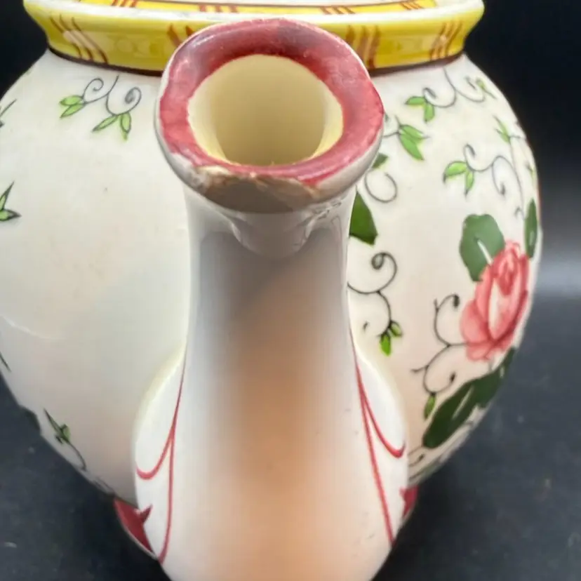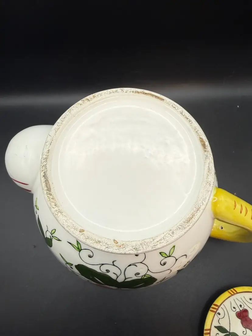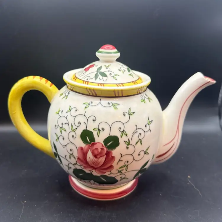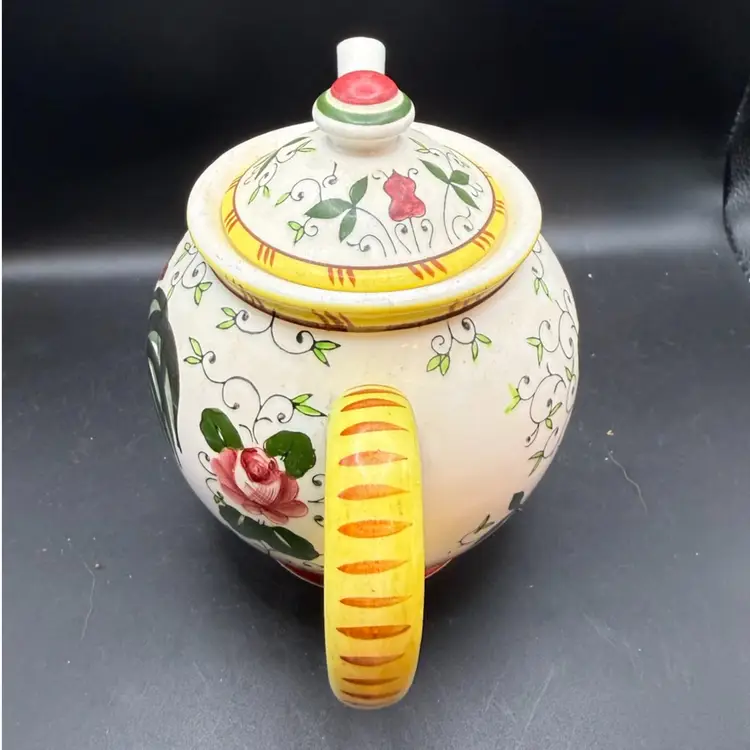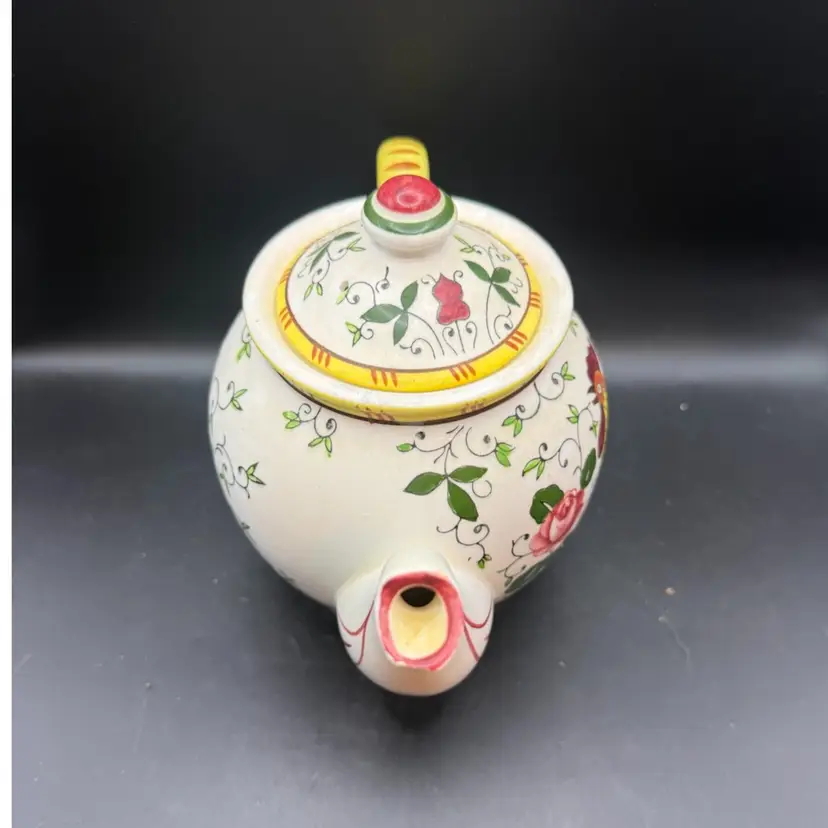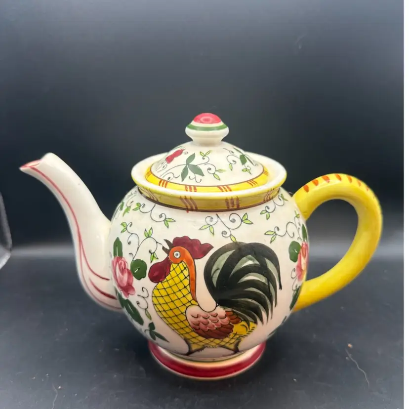 Vintage Early Provincial Rooster and Roses teapot with lid. Nice condition with no crazing or cracks. There is a chip on the end of the spout underneath. Nice color and clean inside! Measures 6" high with lid and 9 1/2" long.