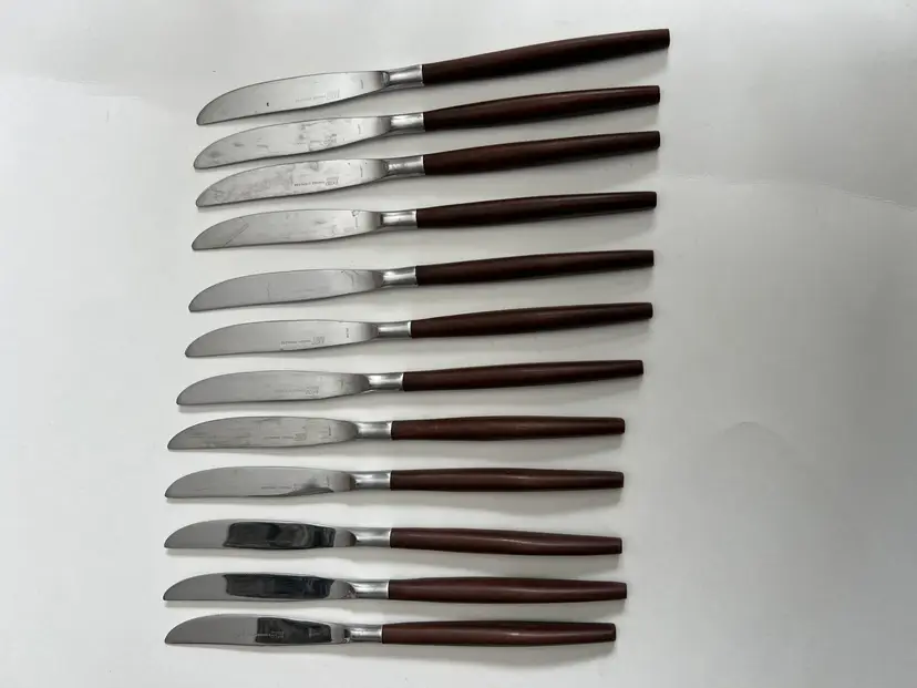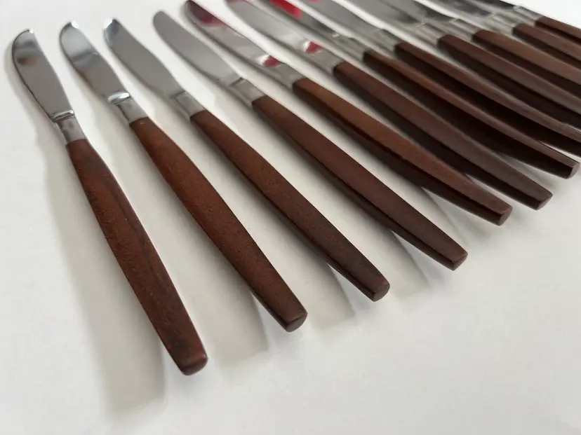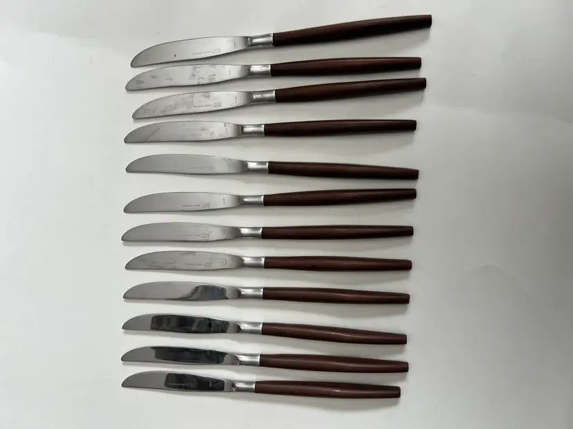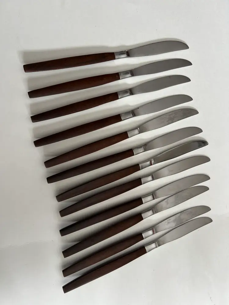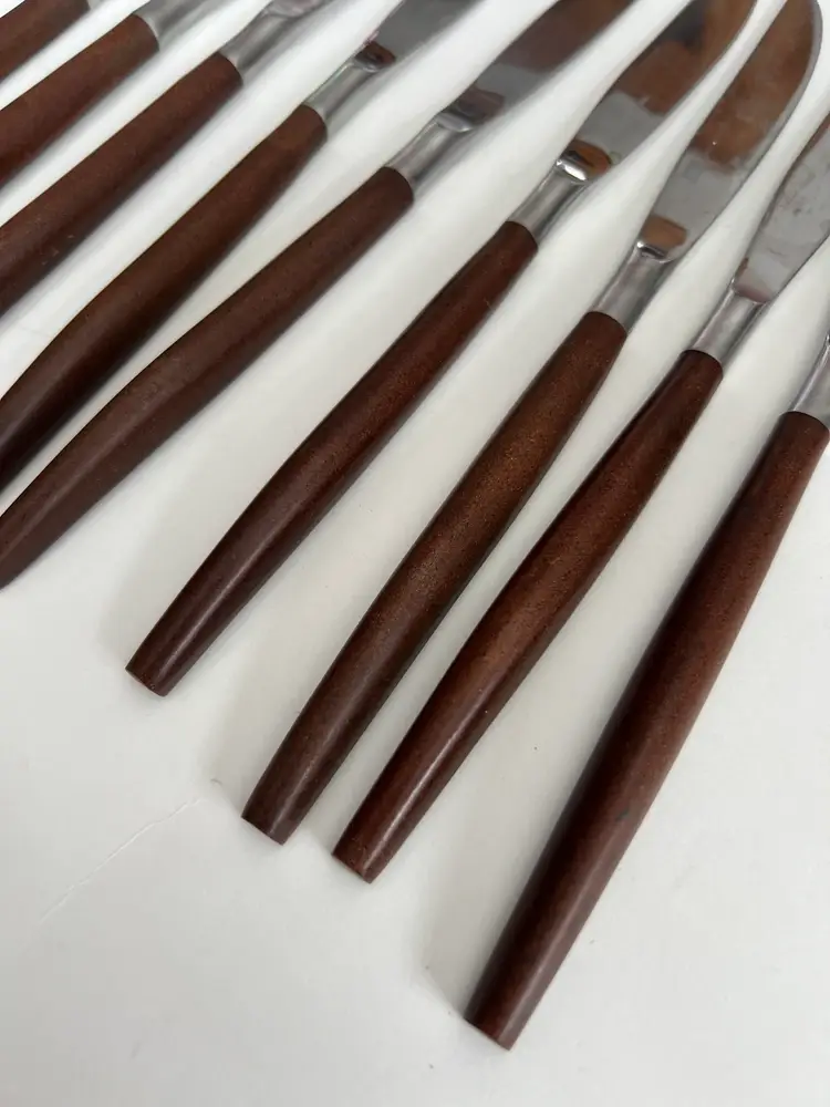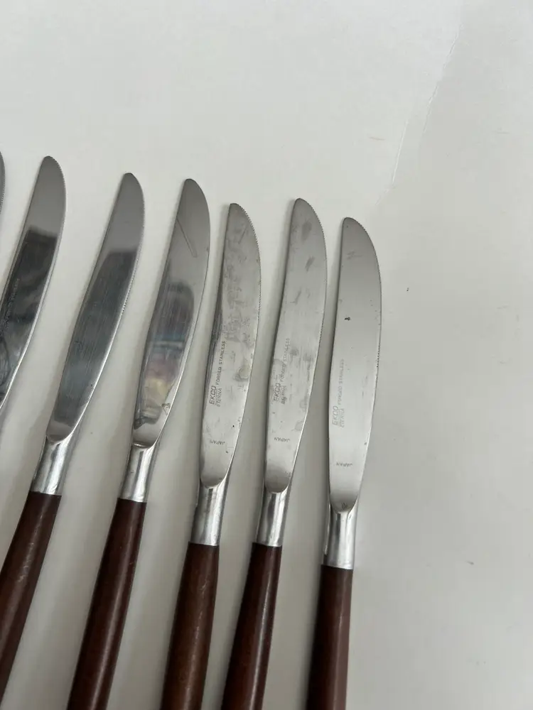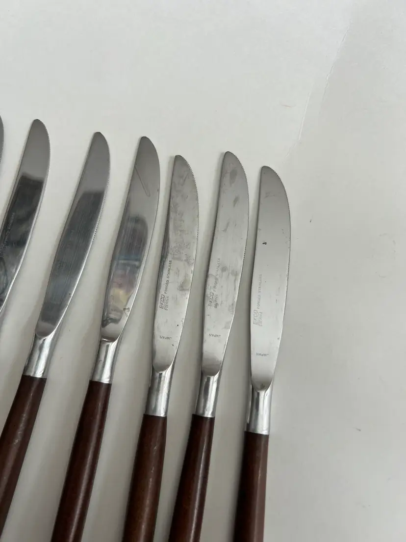 Set of 12 Ecko Eterna knives Wooden handle. Forged Stainless. Good vintage condition with wear consistent with use. Made in Japan. MCM design-