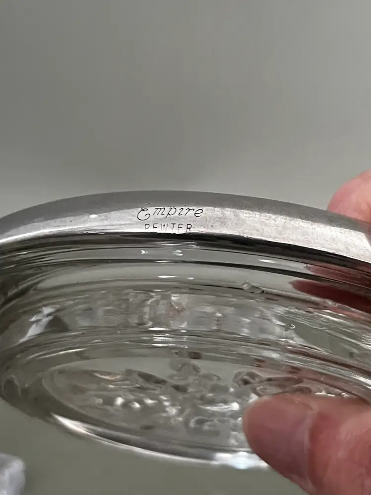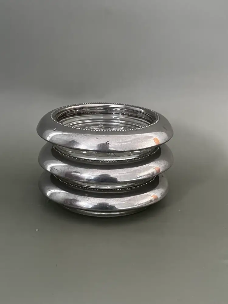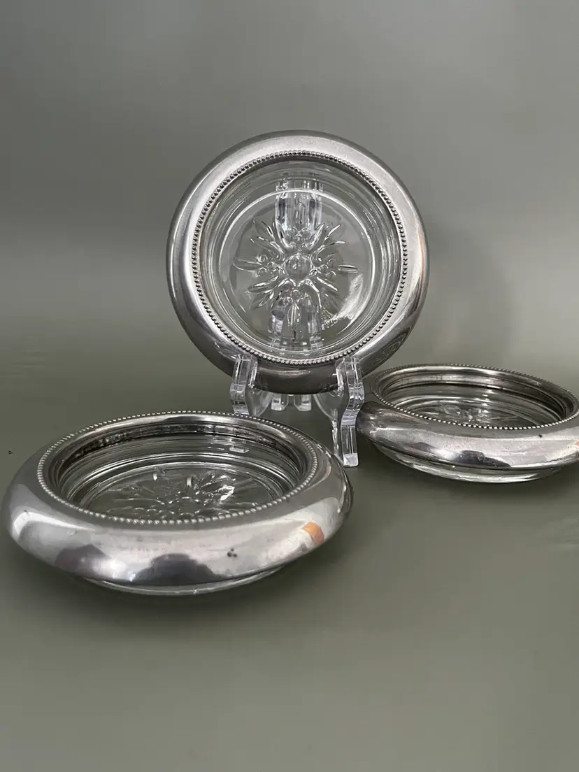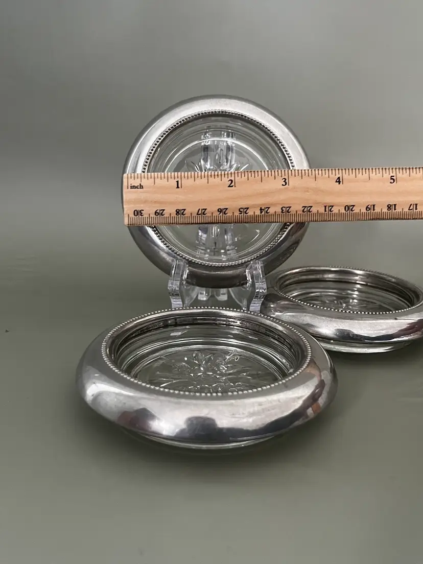 Vintage Empire Pewter glass coasters featuring solid pewter rims with a beaded edge and pressed clear glass centers. Classic mid-century barware, perfect for wine glasses or cocktails.
