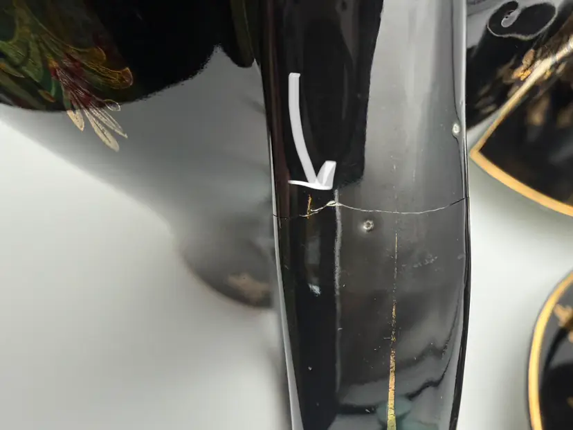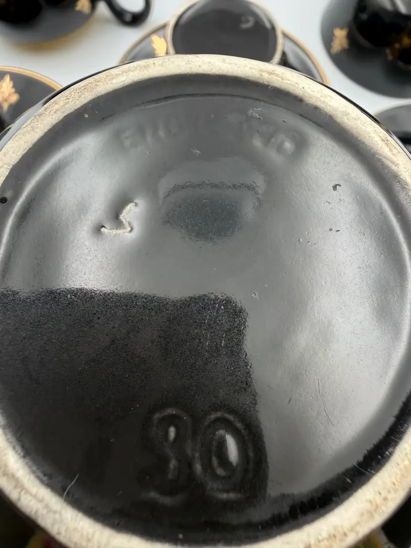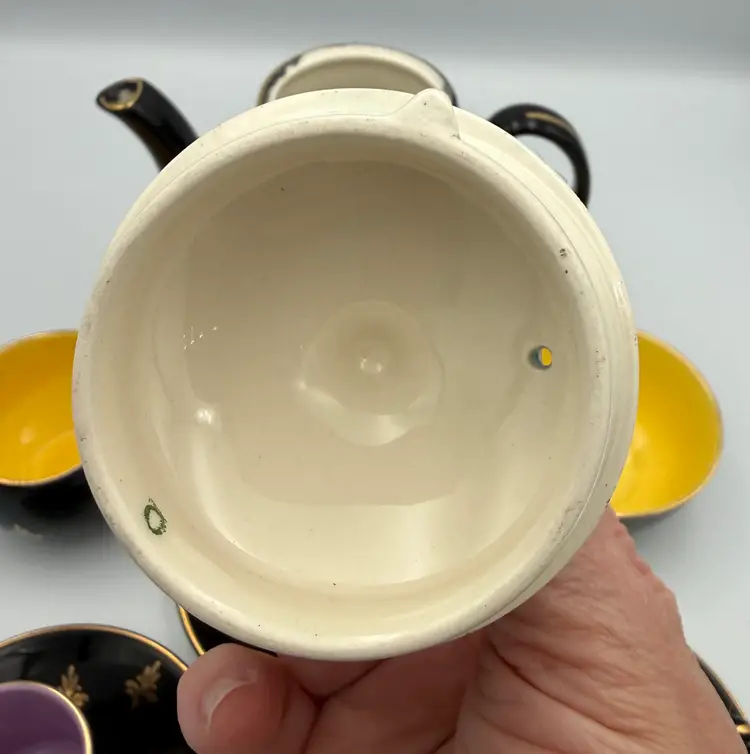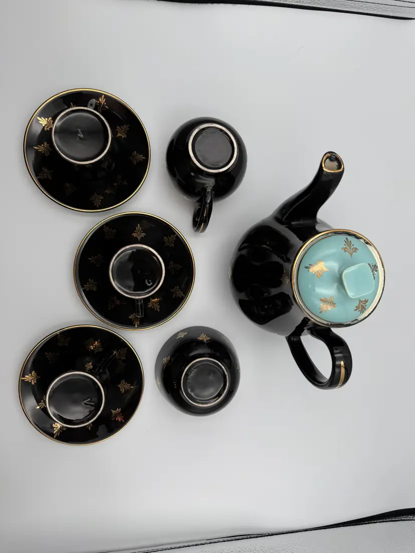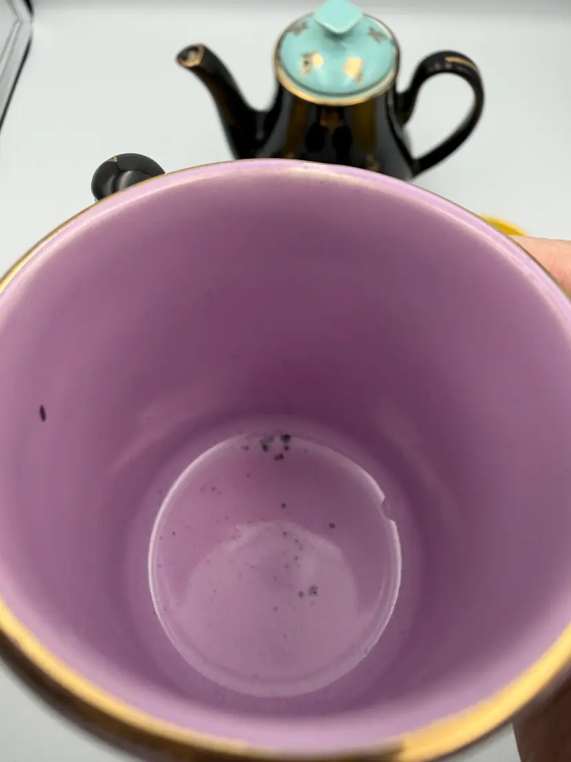 ⚠️ Condition Notes (please read): • This is a vintage set and shows gentle, age-appropriate wear. • The espresso pot has a visible hairline crack at the base of the handle, visible on both sides. It appears stable but should be considered decorative rather than for daily use. • One original cup from the larger Harlequin set had a prior repair and has been removed from this listing. • The remaining pieces show light surface wear and minor gold loss consistent with age. No chips or cracks were noted on the included cups, saucers, creamer, or sugar bowl.