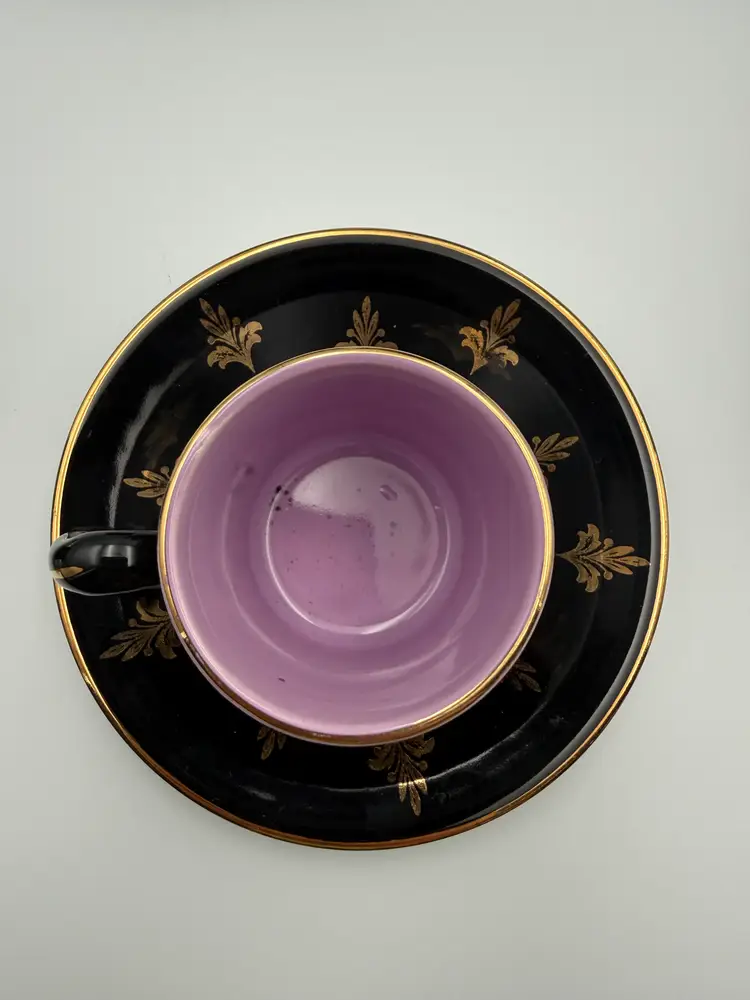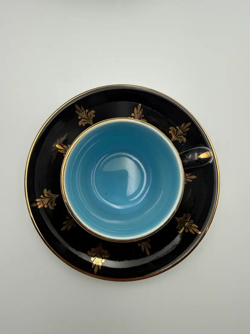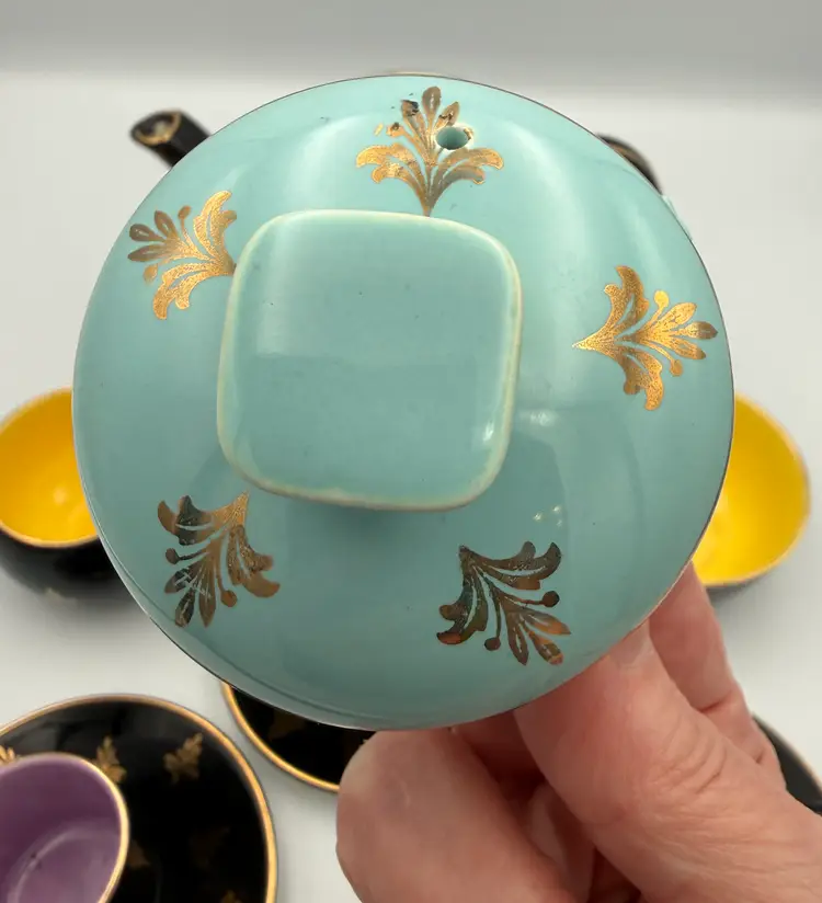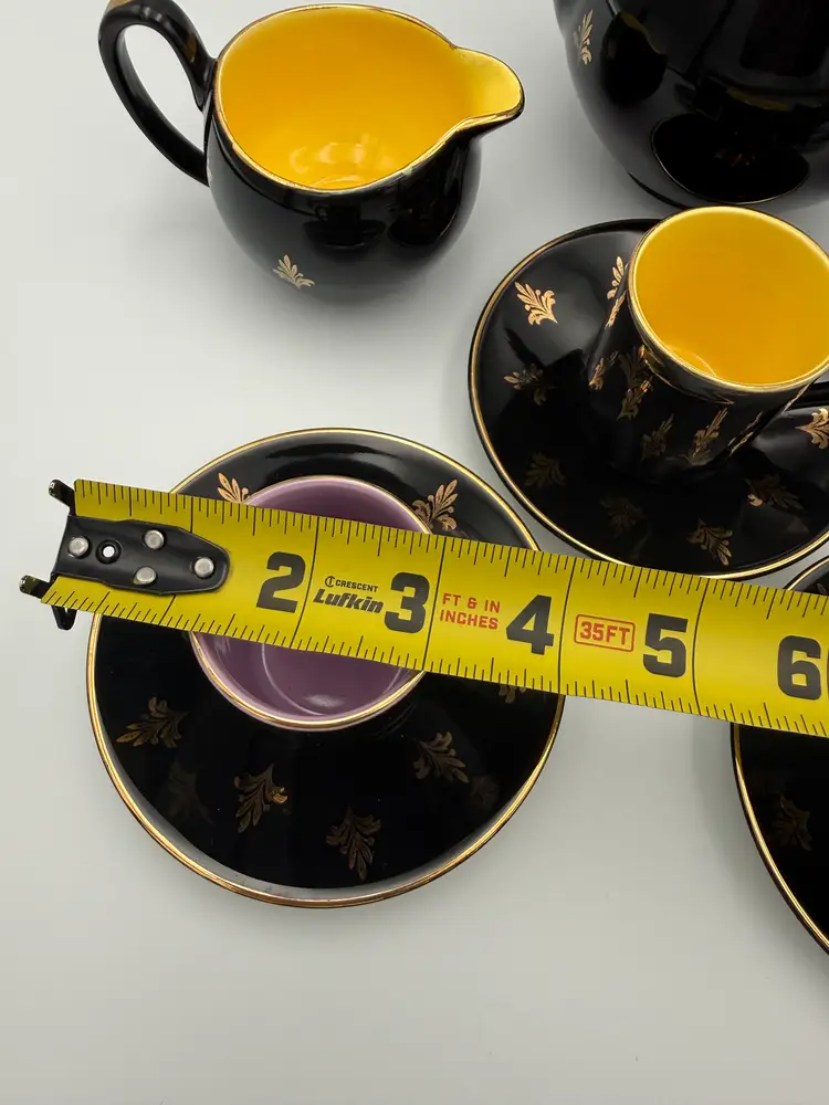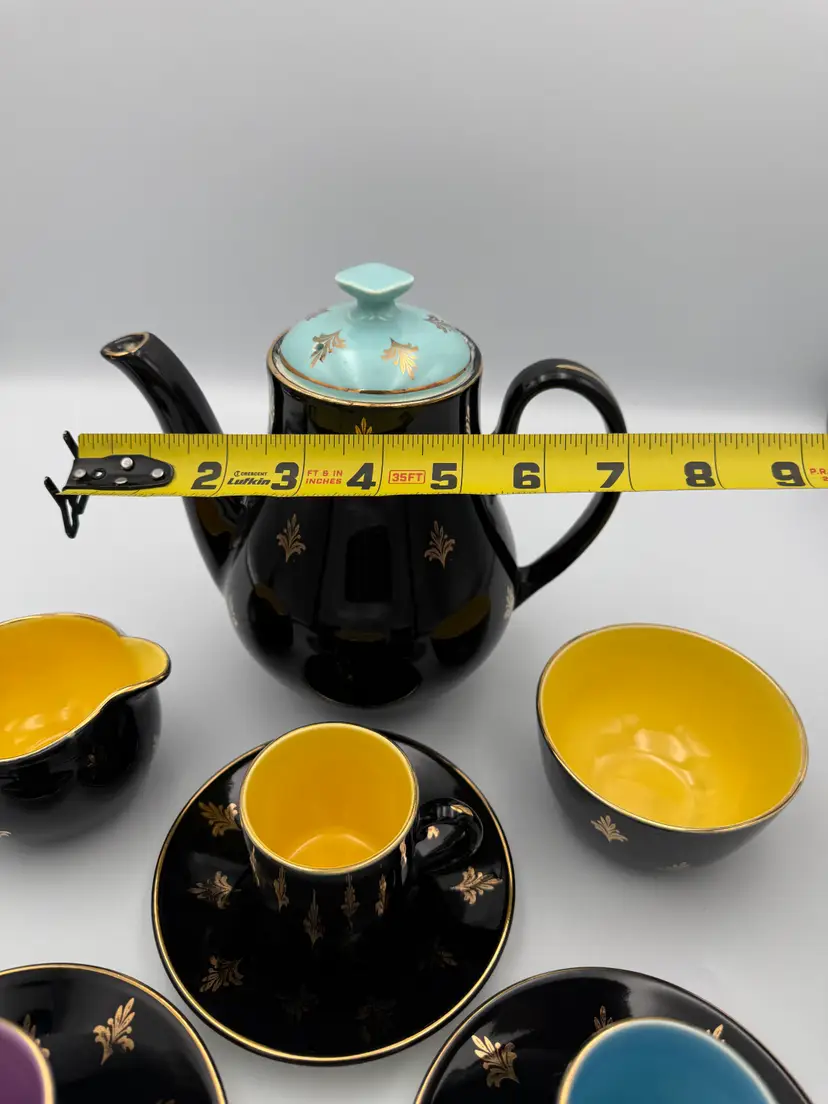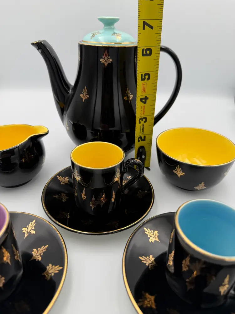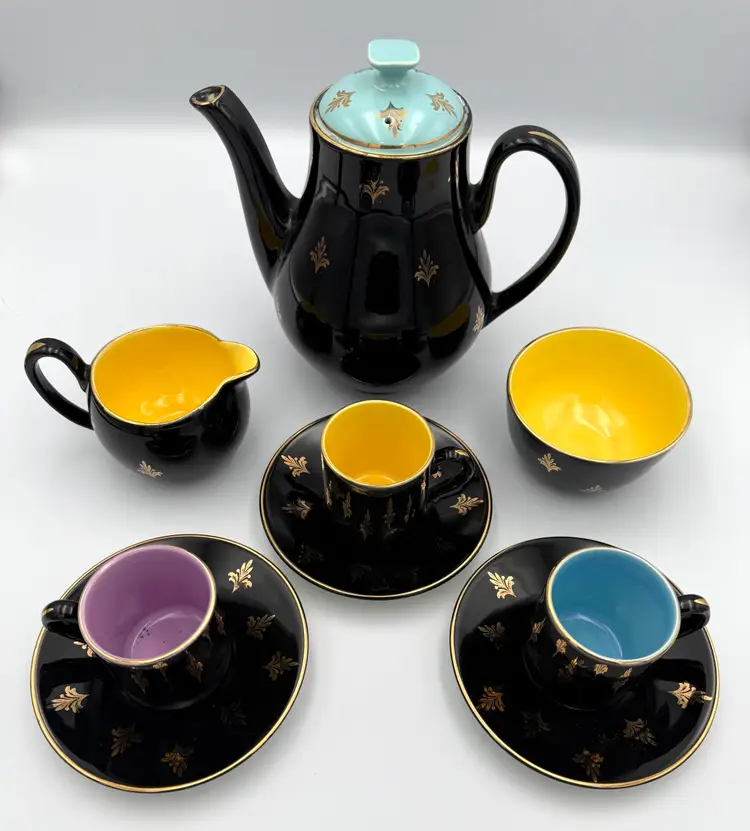 This striking vintage Harlequin espresso set was made in England and features a glossy black exterior decorated with elegant gold foliate motifs, paired with vibrant jewel-tone interiors in yellow, turquoise blue, and lavender. The playful contrast of colors is classic to the Harlequin style, giving this set a bold yet refined mid-century presence.