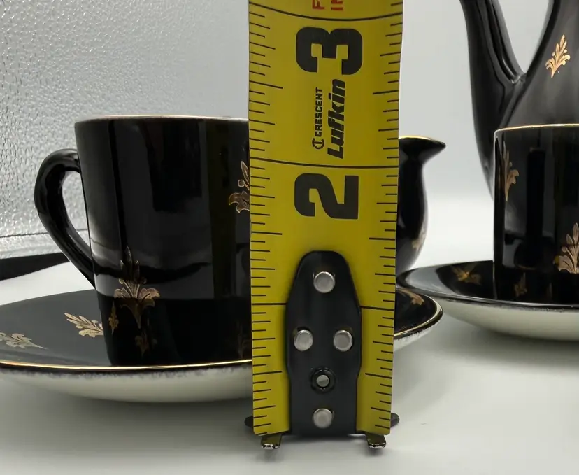 📏 Approximate Measurements: • Espresso pot: approx. 7.5” tall with lid, ~8.5” spout to handle • Cups: approx. 2.5” tall, 3” diameter • Saucers: approx. 5.5” diameter • Creamer: approx. 3.5” tall • Sugar bowl: approx. 3” tall