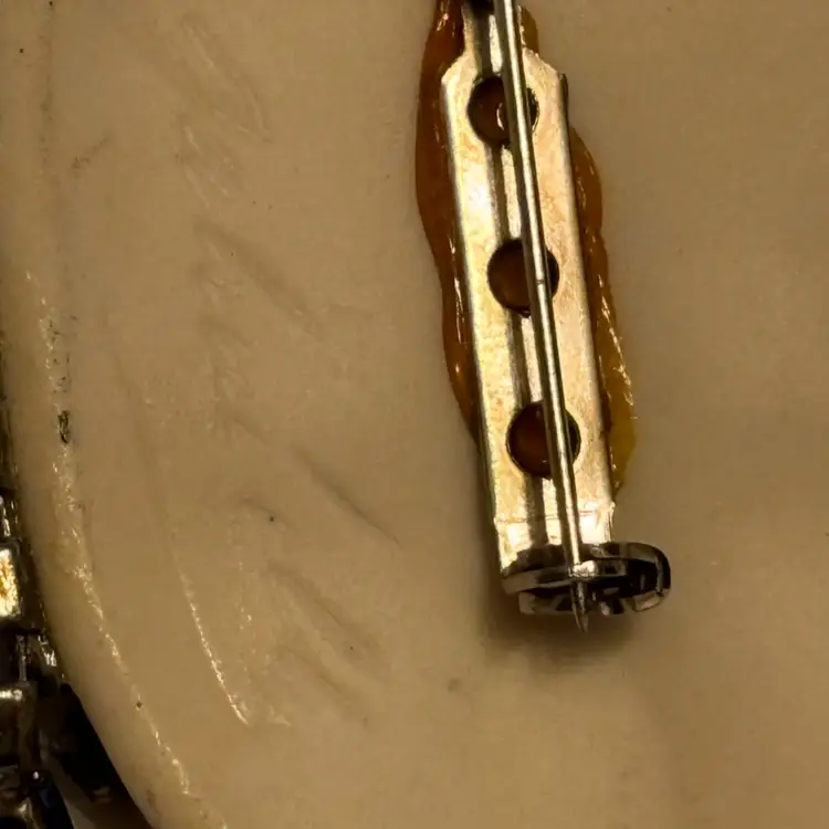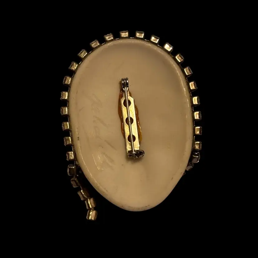 Vintage 70s porcelain flapper brooch with rhinestone accents, signed Gabriella. In nice condition. 2.25”