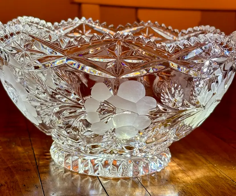 Vintage German Cut & Frosted Crystal Bowl with floral motifs 8.5”, excellent condition