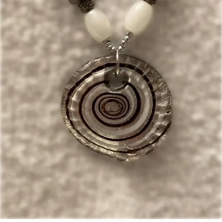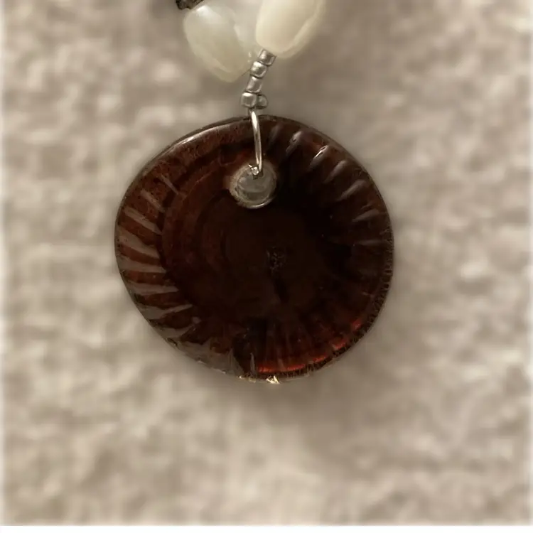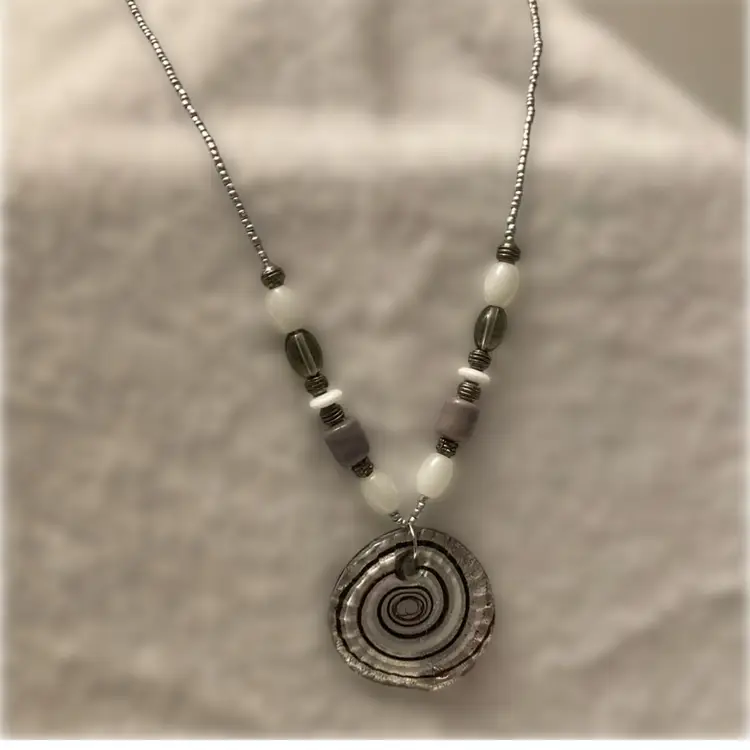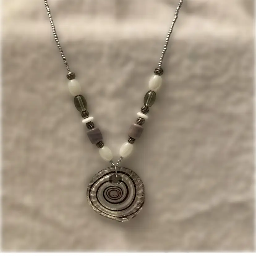 Vintage glass and porcelain beaded necklace with artisan dichroic infinity pendant. Necklace measures 23” to 24” with adjustment. Pendant measures 1 3/4” across. It is reversible. This is a one of a kind upcycled design using vintage beads and findings.