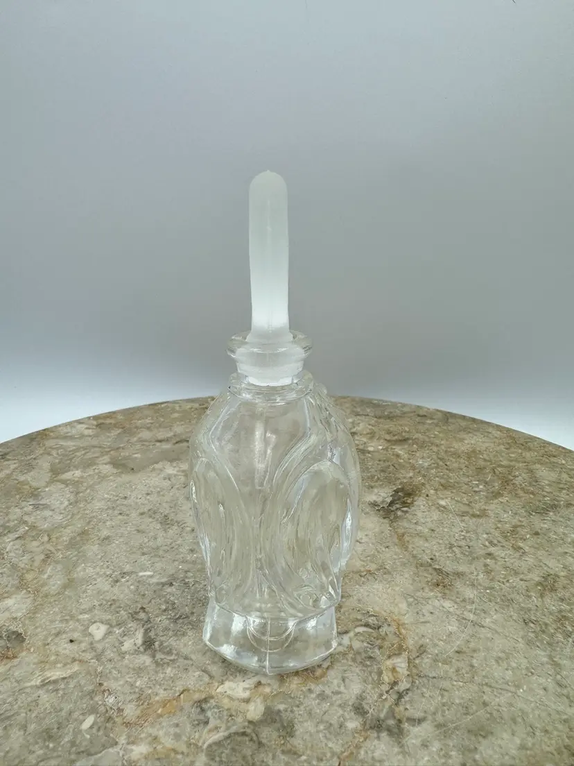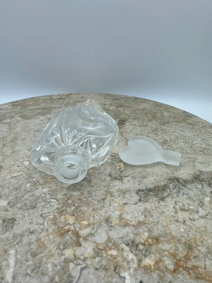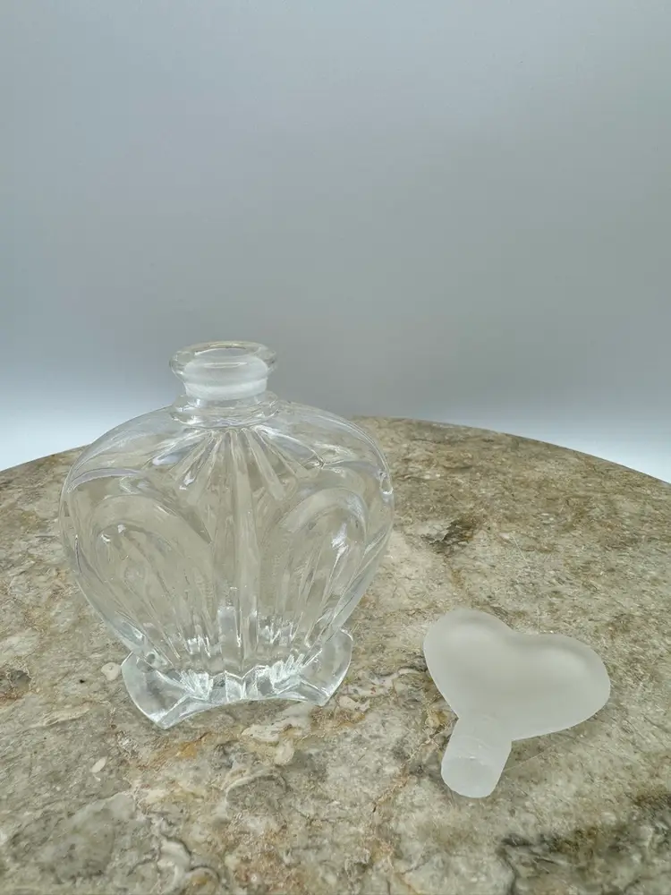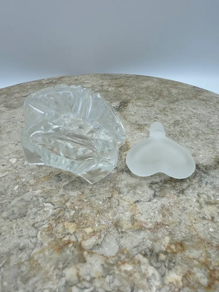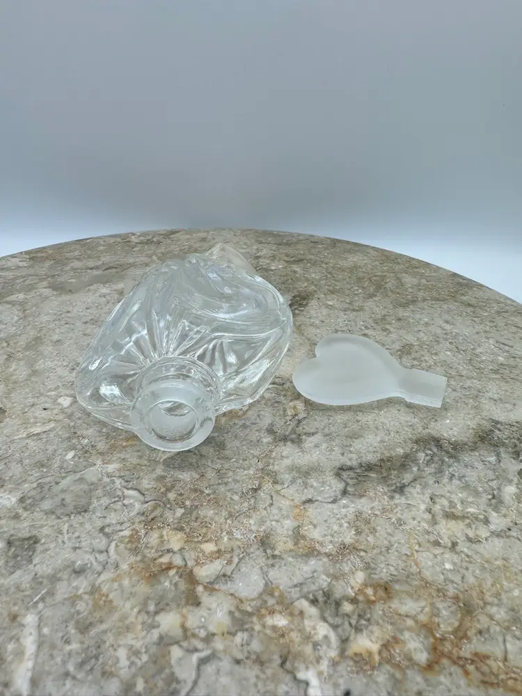 Add a touch of vintage charm to your collection with this beautiful glass perfume bottle. The bottle features a frosted heart stopper, adding a unique touch to its design. The perfume bottle is perfect for those who love to collect vintage items or those who simply appreciate the beauty of glass perfume bottles. This bottle is not only a great addition to any collection, but it also makes for a wonderful gift for someone special. Beautiful condition. No chips or cracks. Measures 4 1/2" X 3"