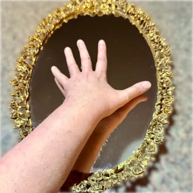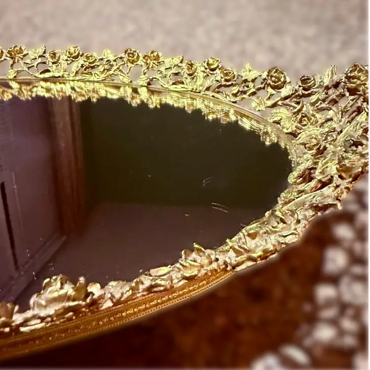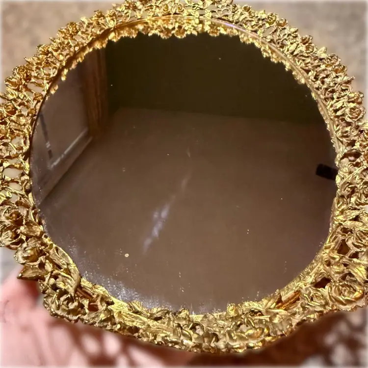 **this mirrored tray is heavy! The rose frame is not the lightweight thin metal you may have experienced with some vanity mirrors. That is not this!