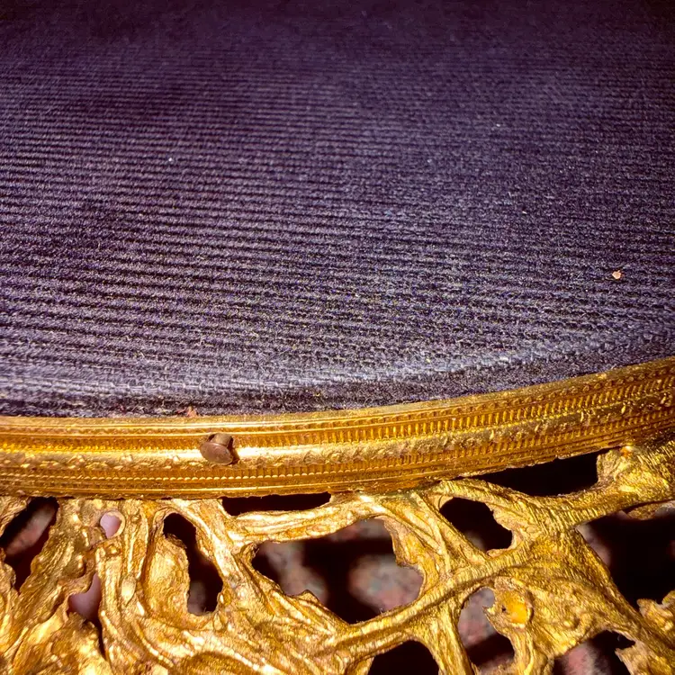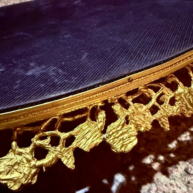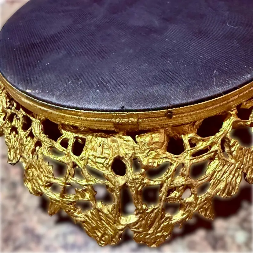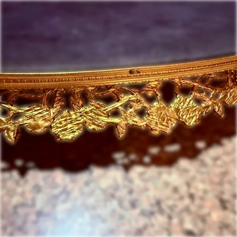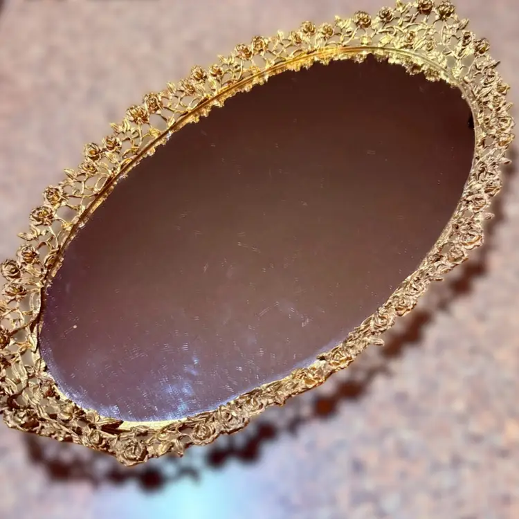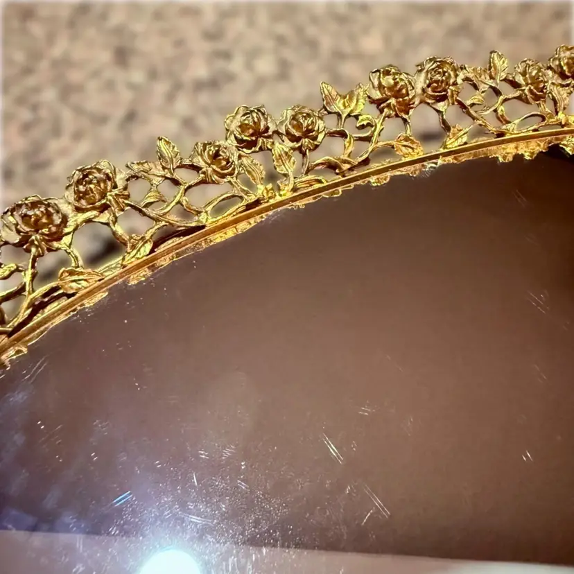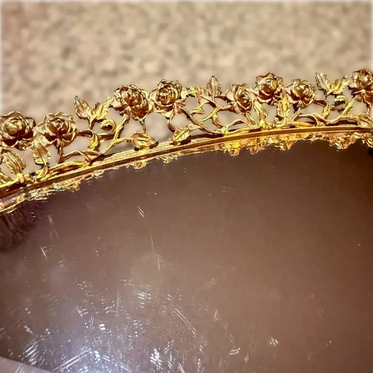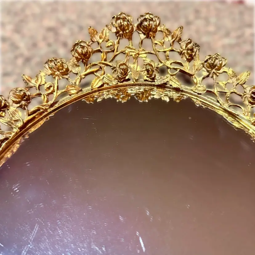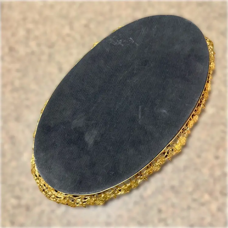 Vintage Gold Plated Ornate Rose Motif Frame w Black Velvet Backing MCM Oval Vanity Mirror Tray