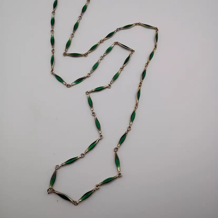 This is a gorgeous green glass and goldtone necklace, very long, and the green glows under blacklight. It's in excellent condition.