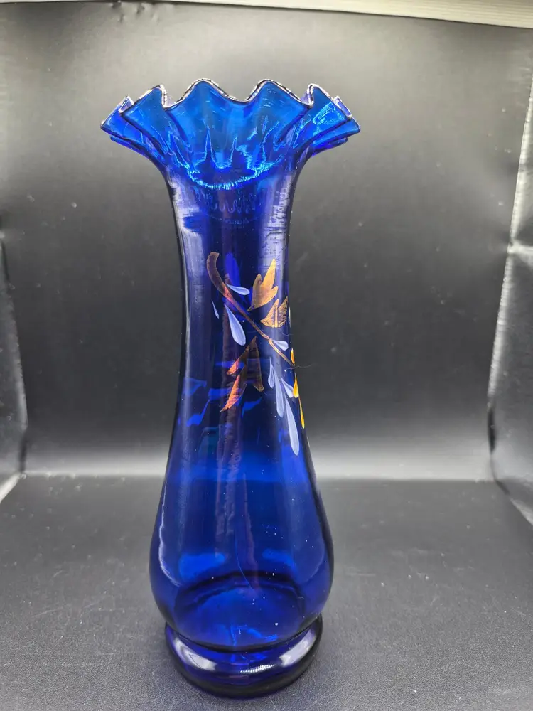 • Hand-painted floral design • Fluted edge for an elegant look • Vibrant cobalt blue glass • Vintage aesthetic with timeless charm • Ideal for home decoration 8.5 inches