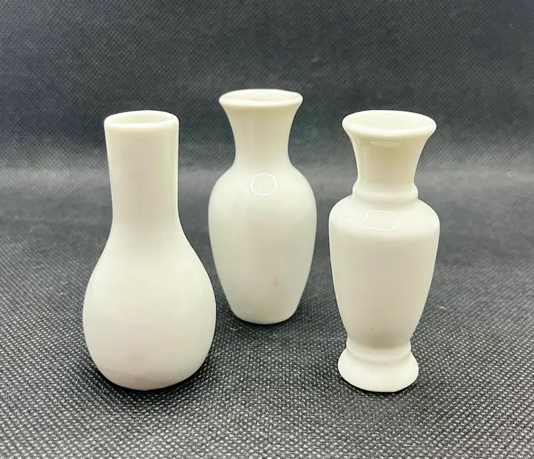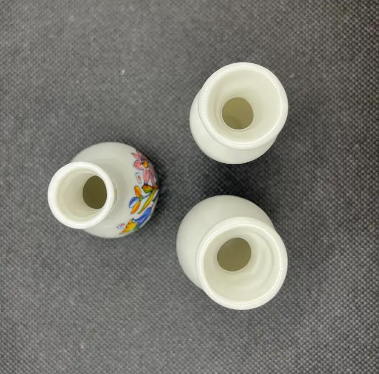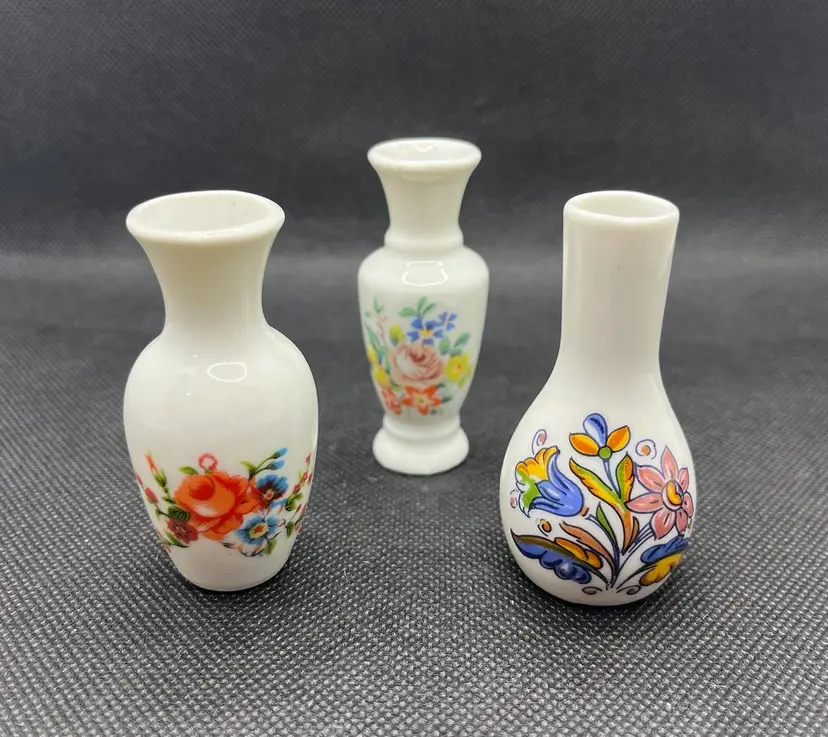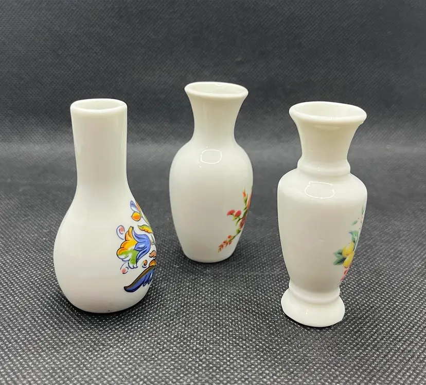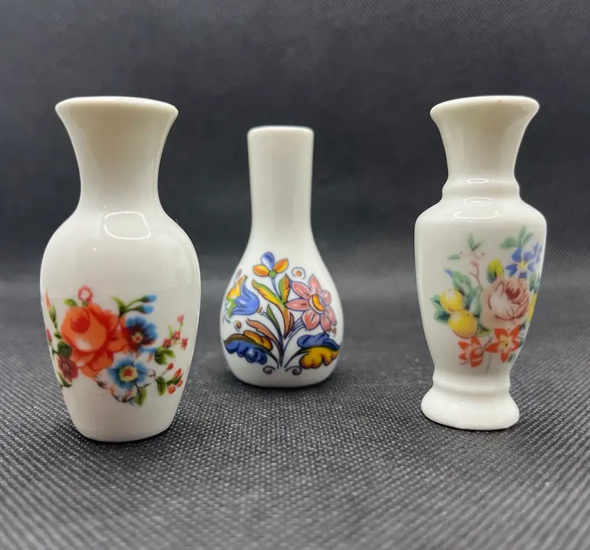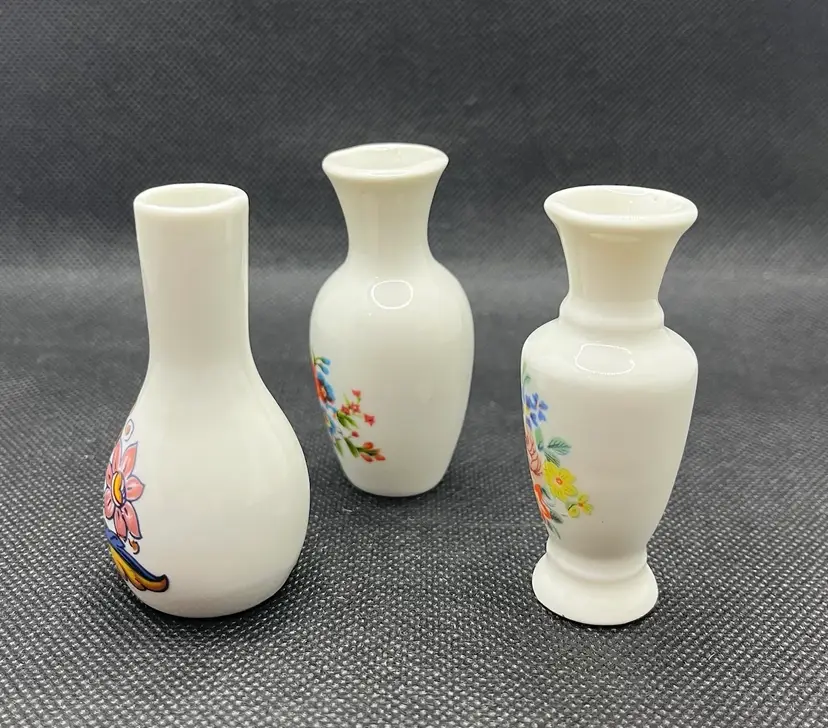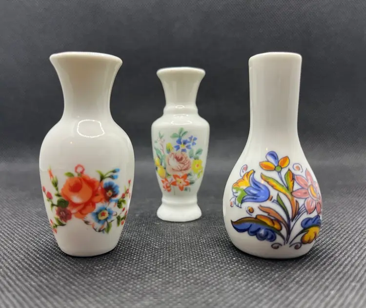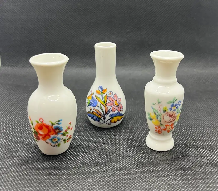 These are vintage hand-painted ceramic bud vases. The set includes three mini vases, each with a unique shape and distinct, vibrant floral designs.