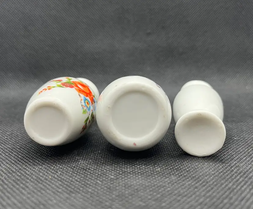 They are made of white ceramic or porcelain with colorful, hand-painted decorations. 2.75” with minor surface wear and no chips or cracks.