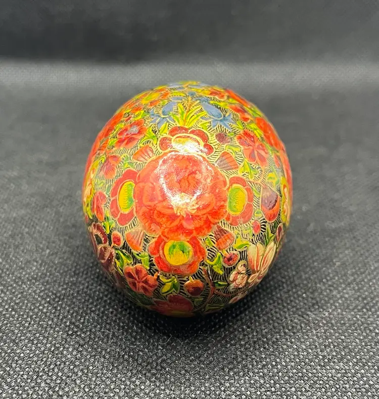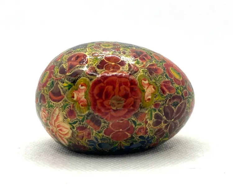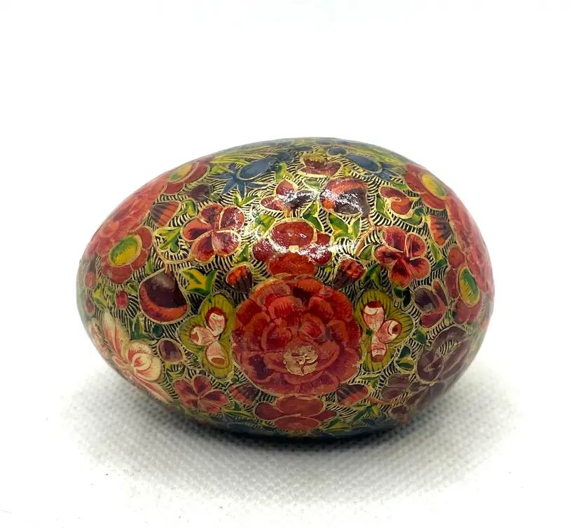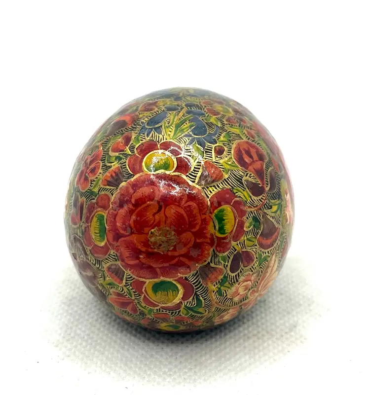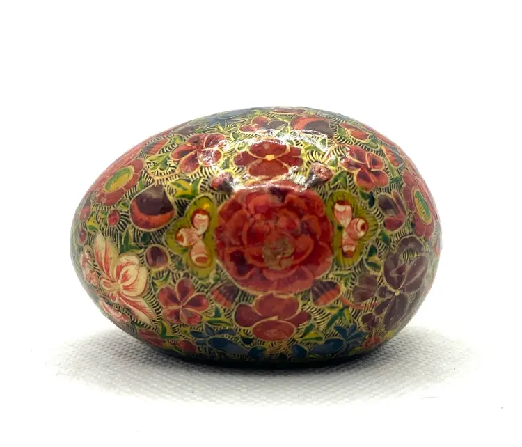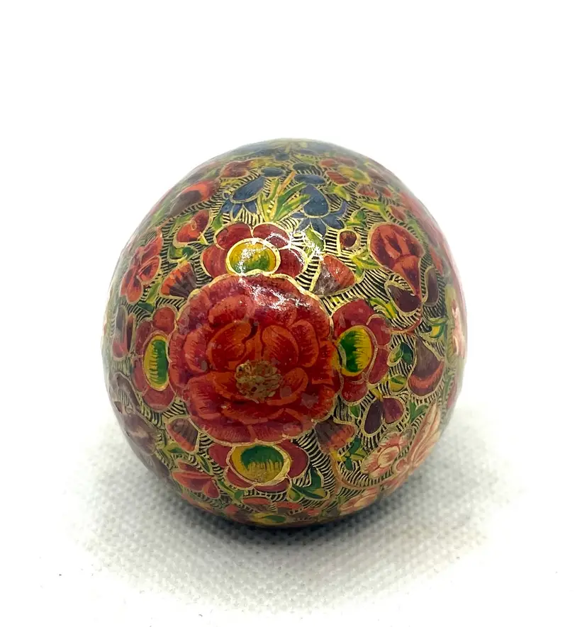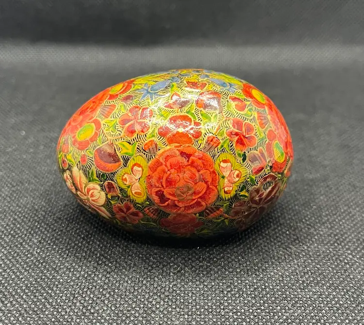 his is a vintage, hand-painted Kashmiri papier-mâché egg. It is made from layers of recycled paper and adhesive, which are then shaped and smoothed with layers of gesso.