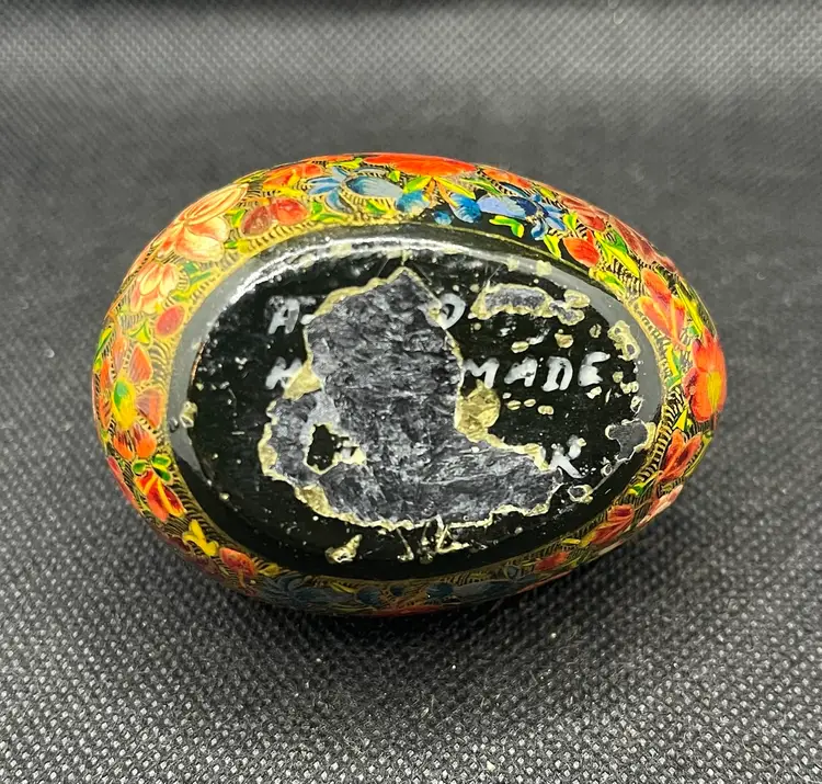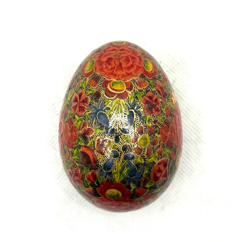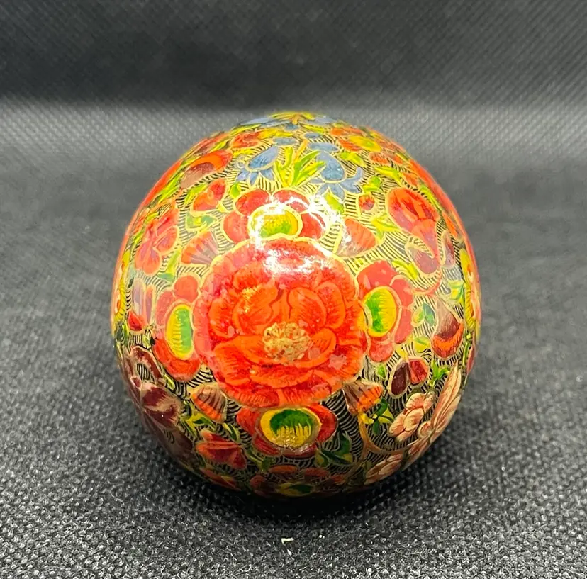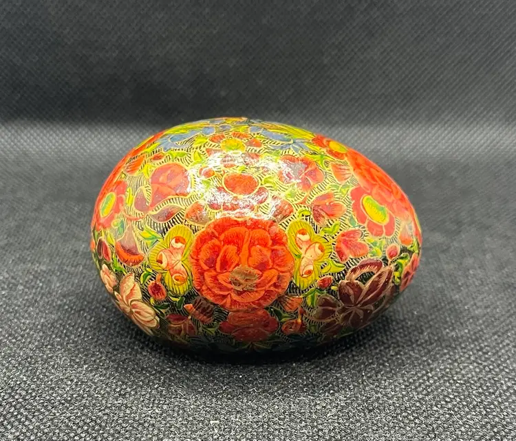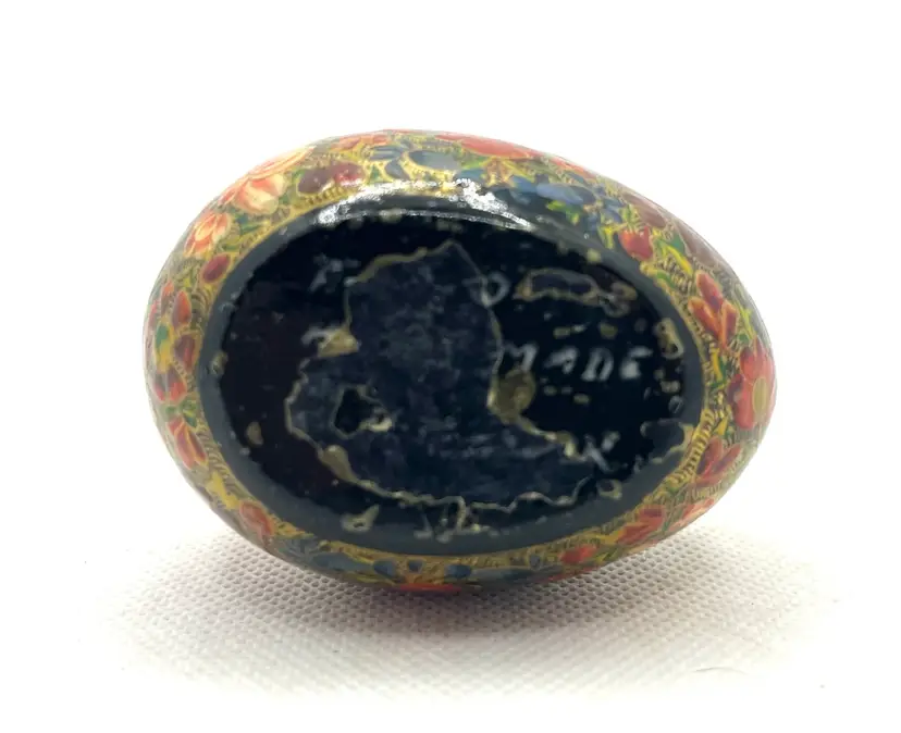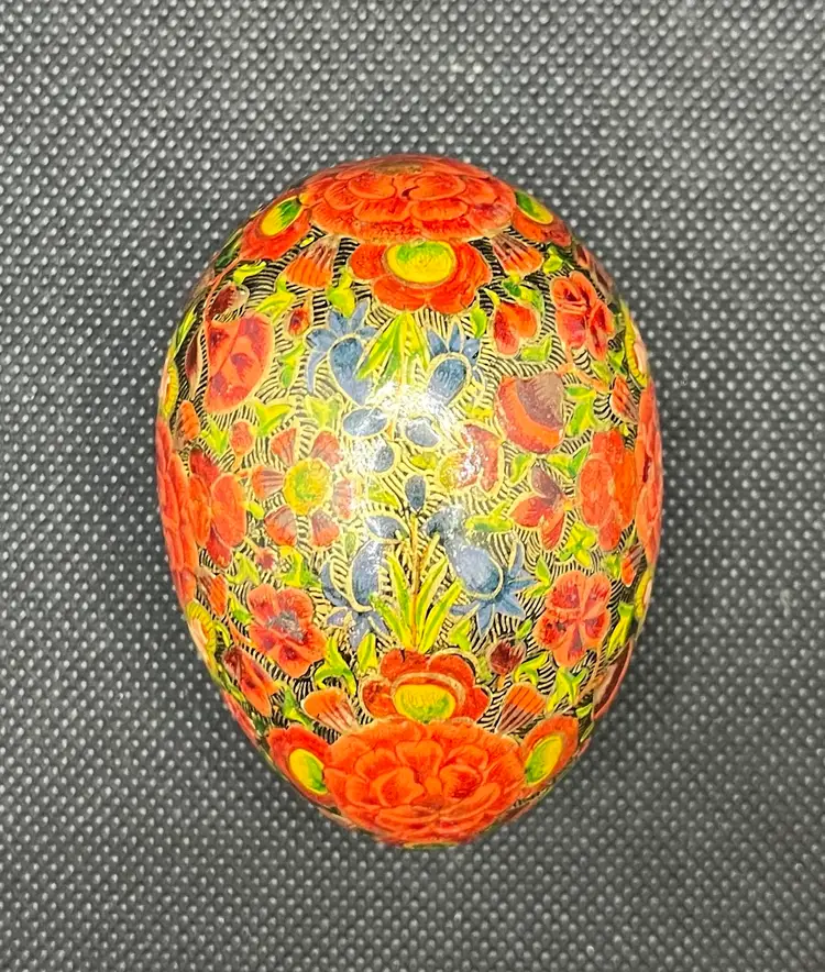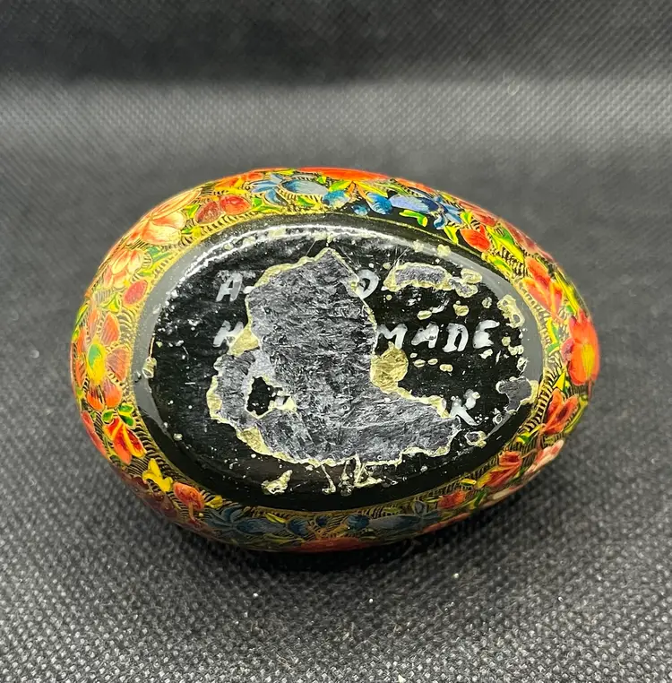 his is a vintage, hand-painted Kashmiri papier-mâché egg. It is made from layers of recycled paper and adhesive, which are then shaped and smoothed with layers of gesso.