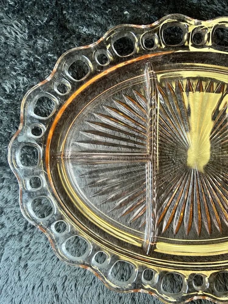 Design: The platter is oval-shaped with an intricate lace-style rim and is divided into five sections.