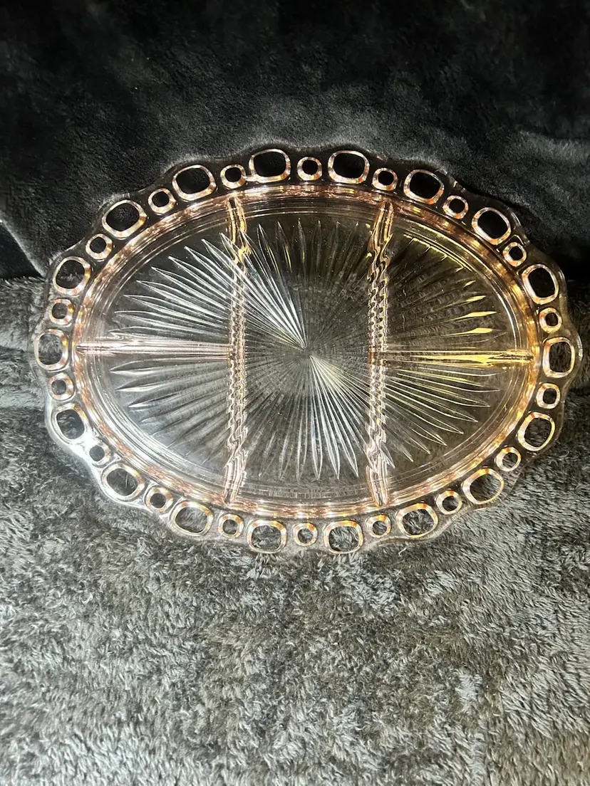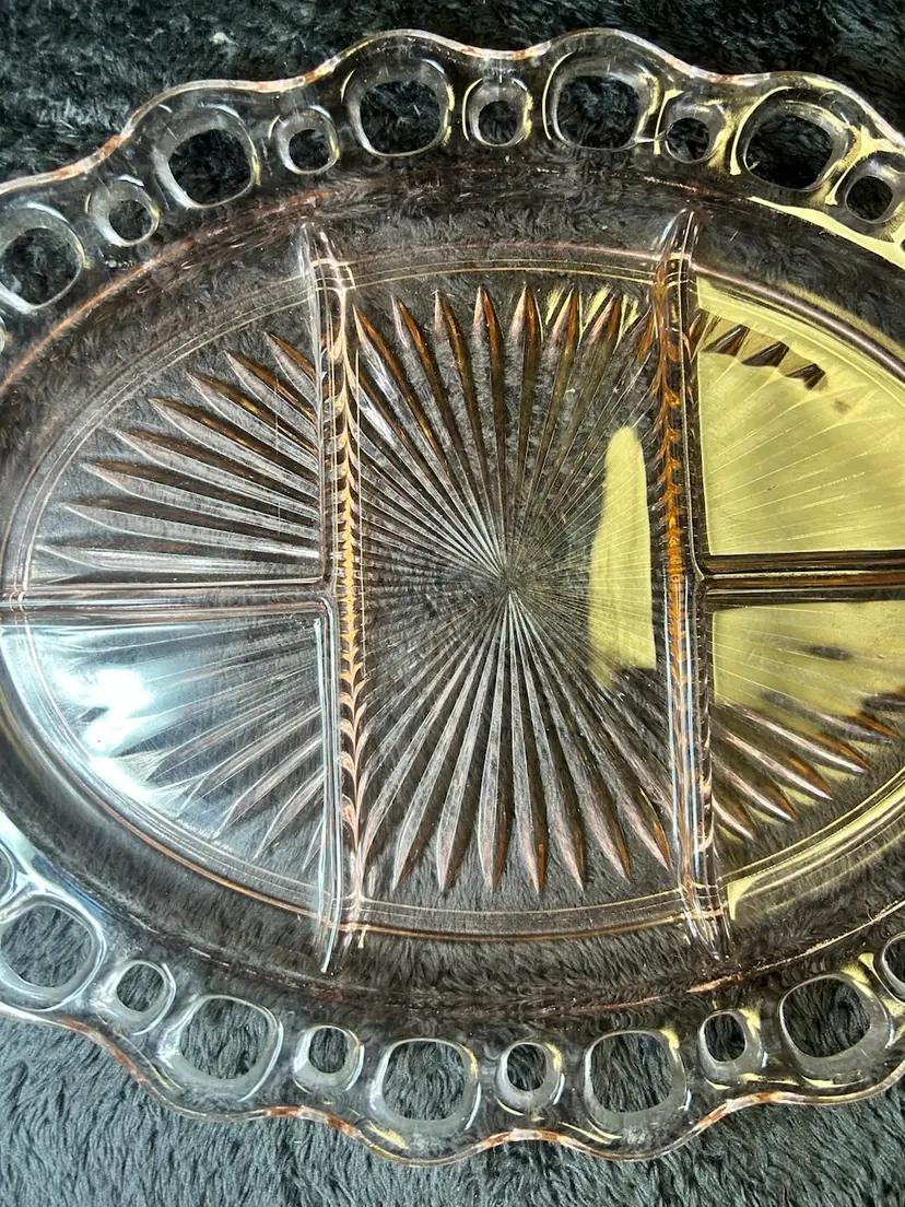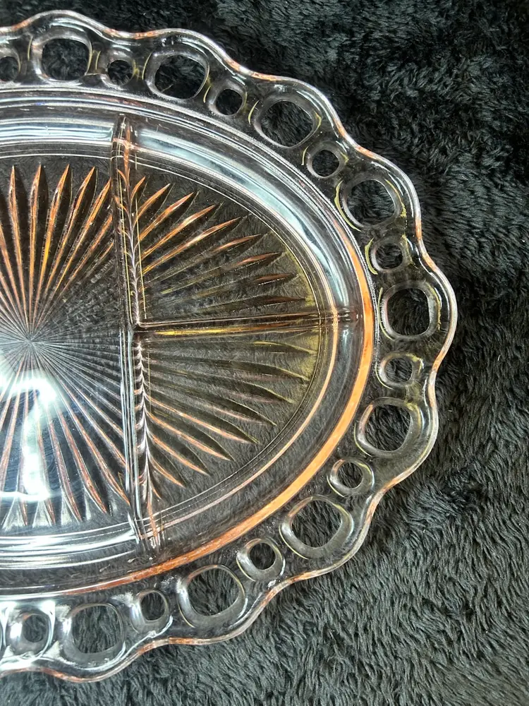 Design: The platter is oval-shaped with an intricate lace-style rim and is divided into five sections.