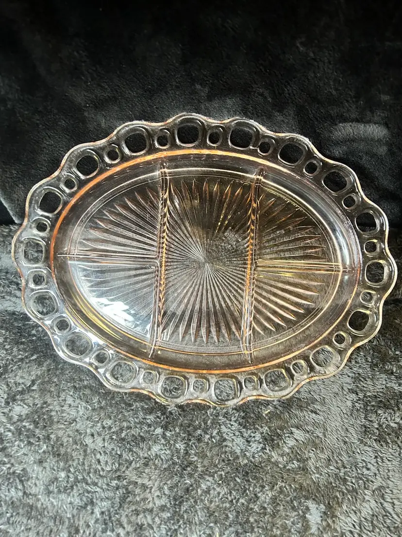 This is a pink Depression glass oval platter in the "Old Colony" (also known as "Open Lace" or "Lace Edge") pattern, made by the Hocking Glass Company (later Anchor Hocking).