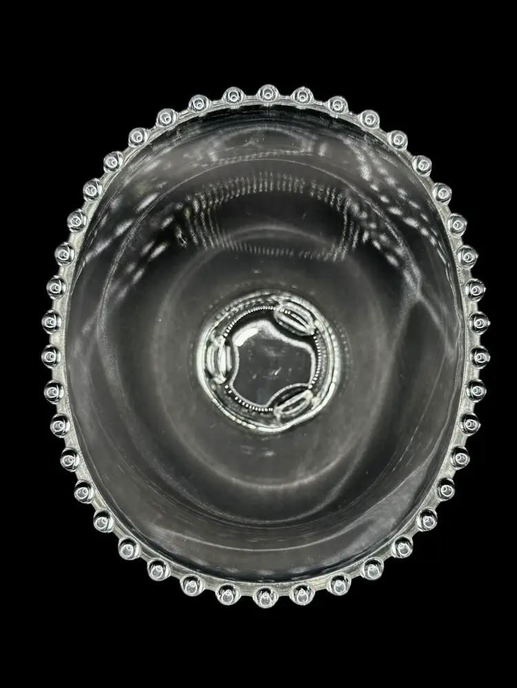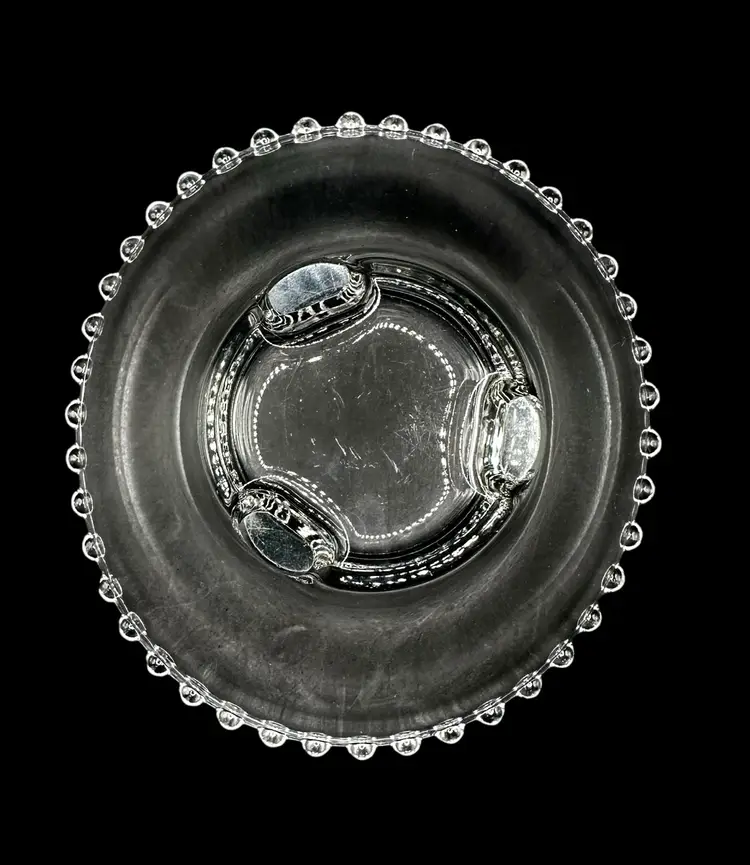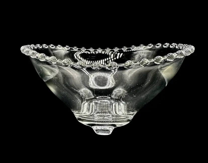 Measures 6.5” across and 3” tall, has a scalloped shape.