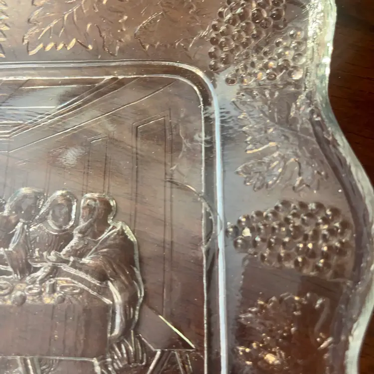 Glassware featuring religious or artistic motifs has been popular for centuries, serving both functional and decorative purposes. This particular piece, with its embossed grape and vine border, likely draws inspiration from biblical symbolism associated with wine and sustenance, further connecting it to the theme of The Last Supper. Such items were commonly produced for home use, particularly during religious holidays like Easter.
