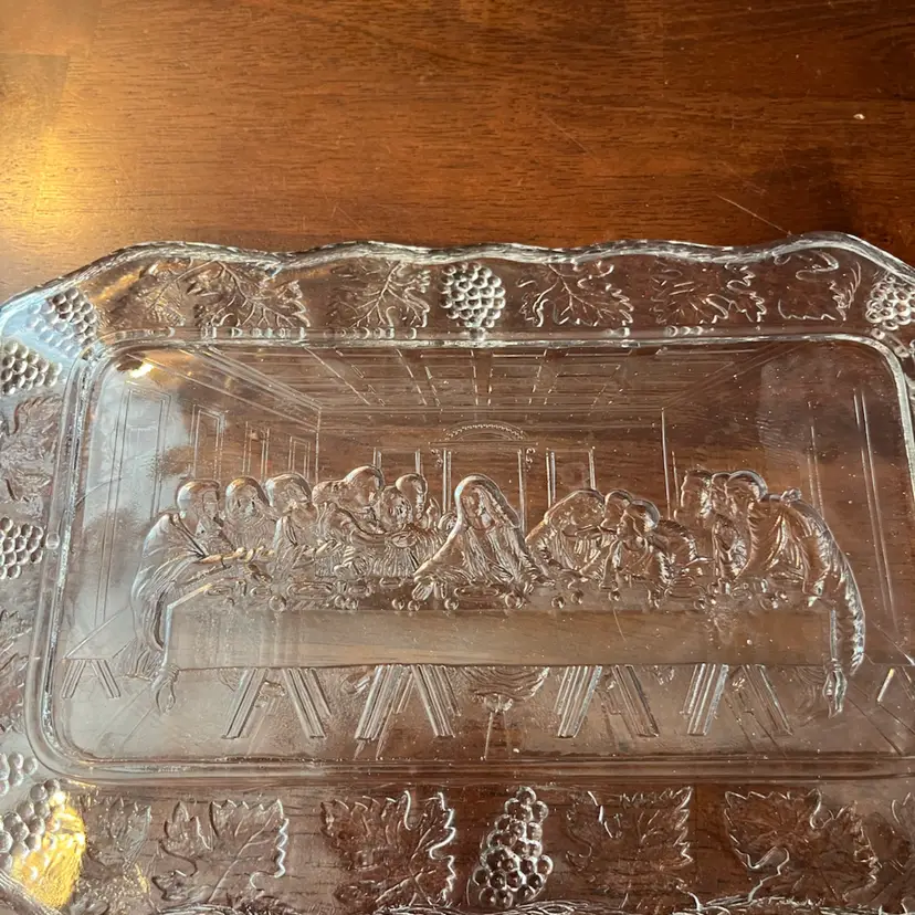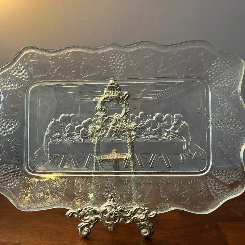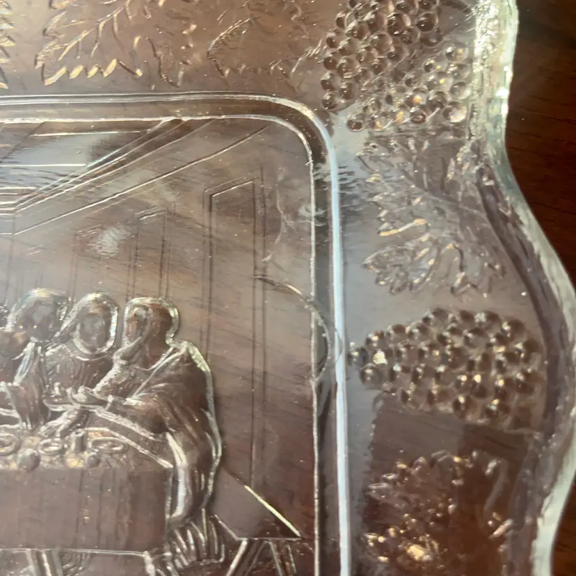 Vintage Indiana clear glass platter depicting 'The Last Supper' with grape border. 11” x 7” Cracks On Right Side Of Plate .