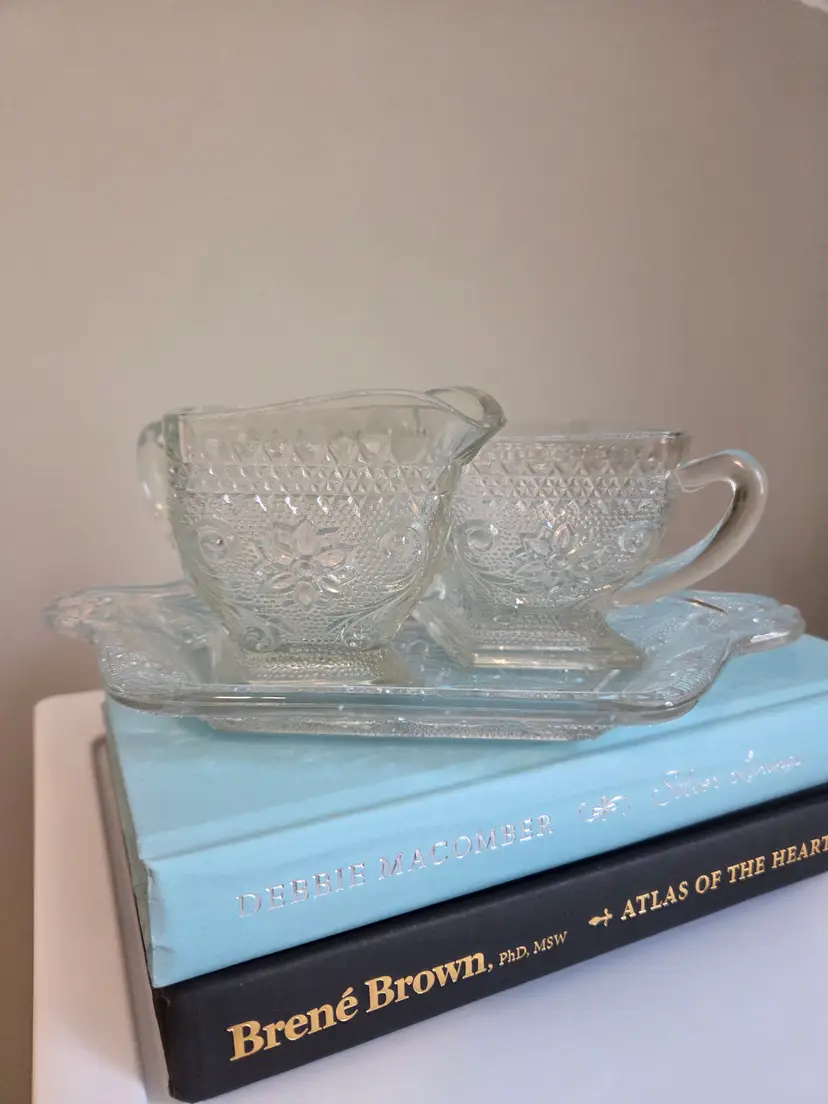 Vintage Indiana Glass "Sandwich" pattern clear glass creamer and sugar set with a matching tray is a 3-piece set made of pressed glass, known for its elegant floral and scroll design.