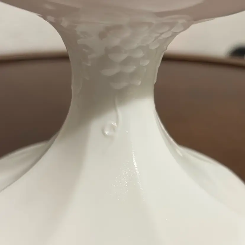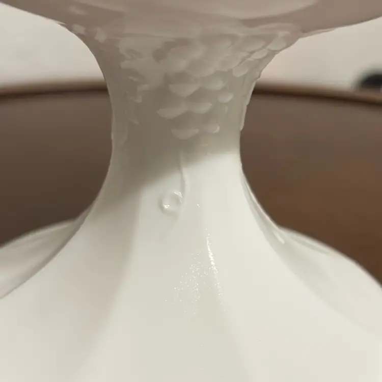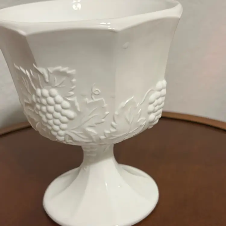Opaque white footed bowl with a flared, paneled, or octagon-shaped top and a pedestal base. Era: This style of glass was popular in the 1960s and 1970s.