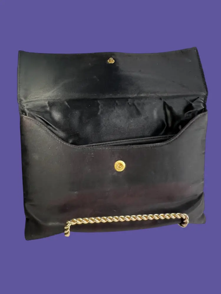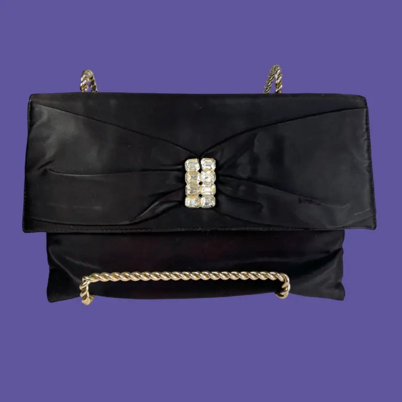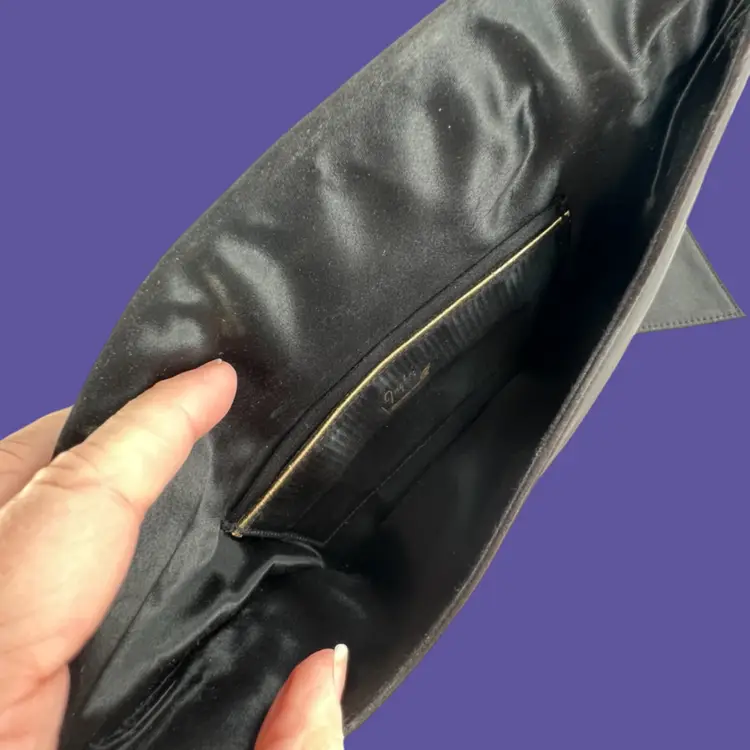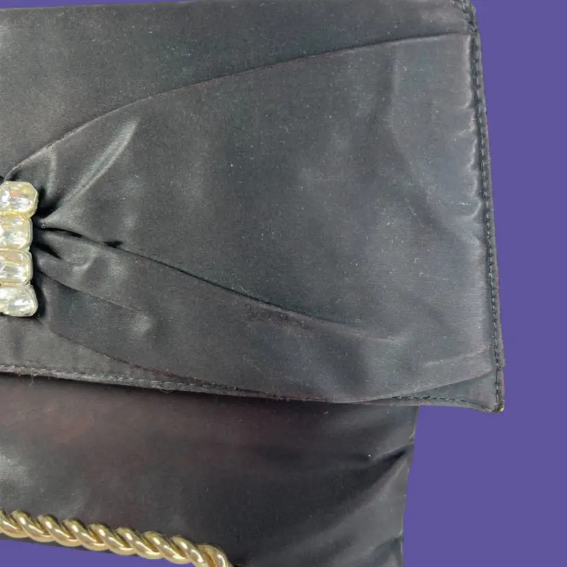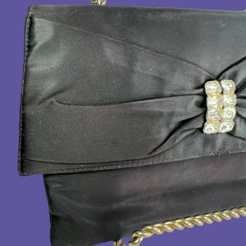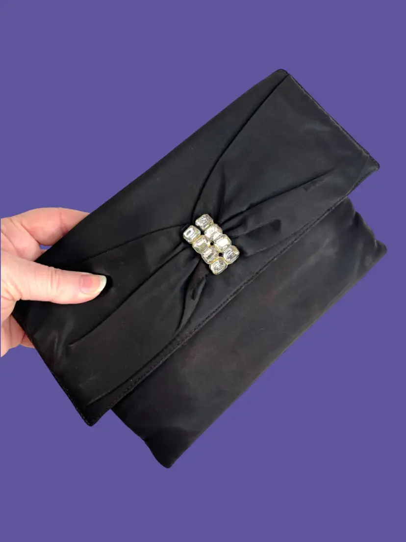 Vintage Ingber Black Satin Evening Clutch Purse Handbag. Bow with Rhinestone Bling. Includes a Silhouette Black Eyeglass Case. Ingber & Company was founded by brothers, Issac and David Ingber in 1903. It closed in 1966. 10” L x 6” H x 1” D Weighs 6 ounces Condition: Please see photos closeups. The rhinestone clip bottom needs reattached to purse. Rub wear in spots and edges. Back right top has a strange whitish semi-circle area.