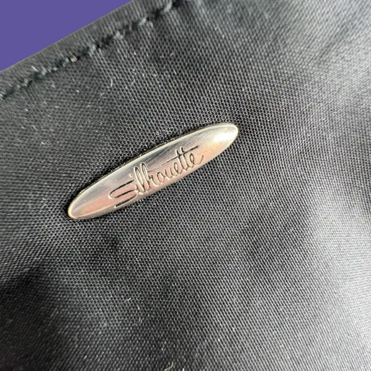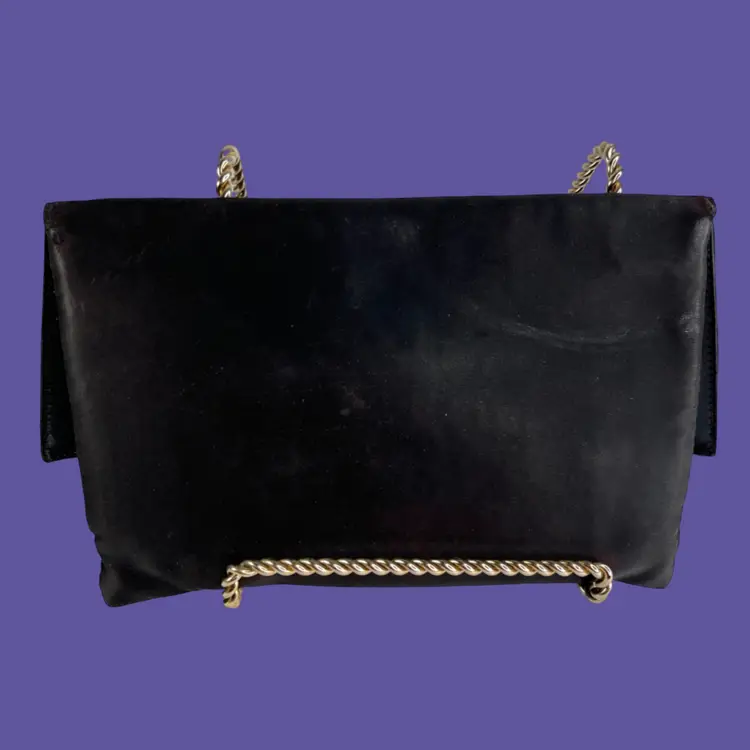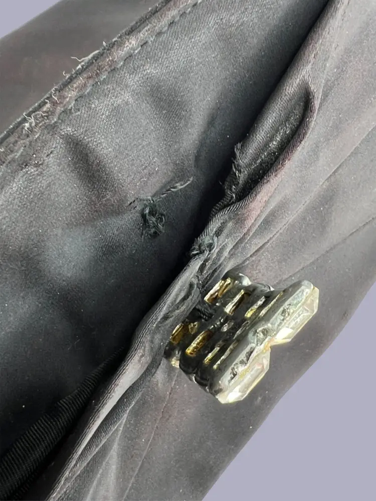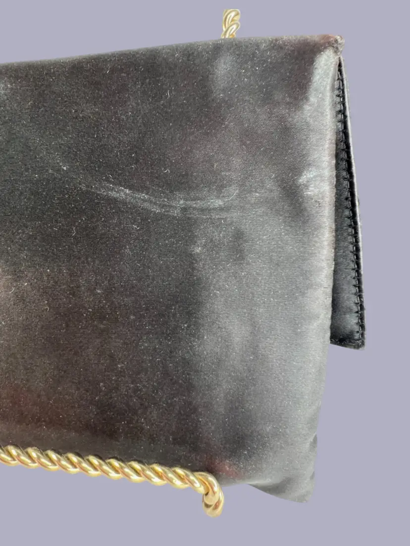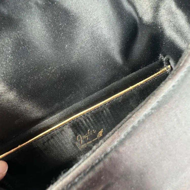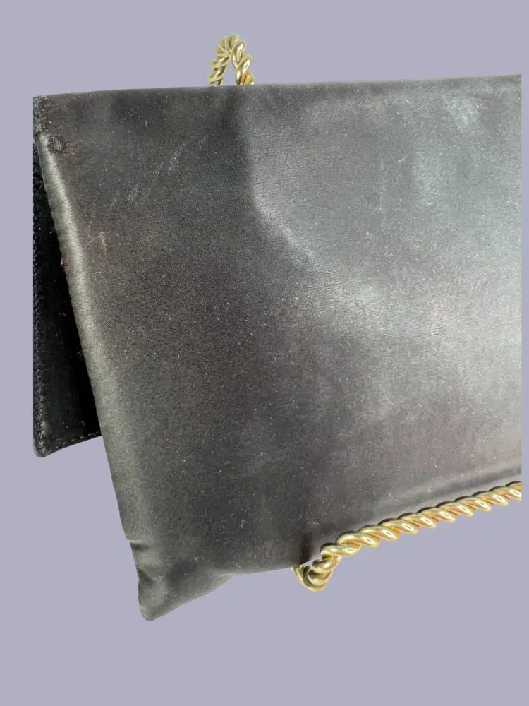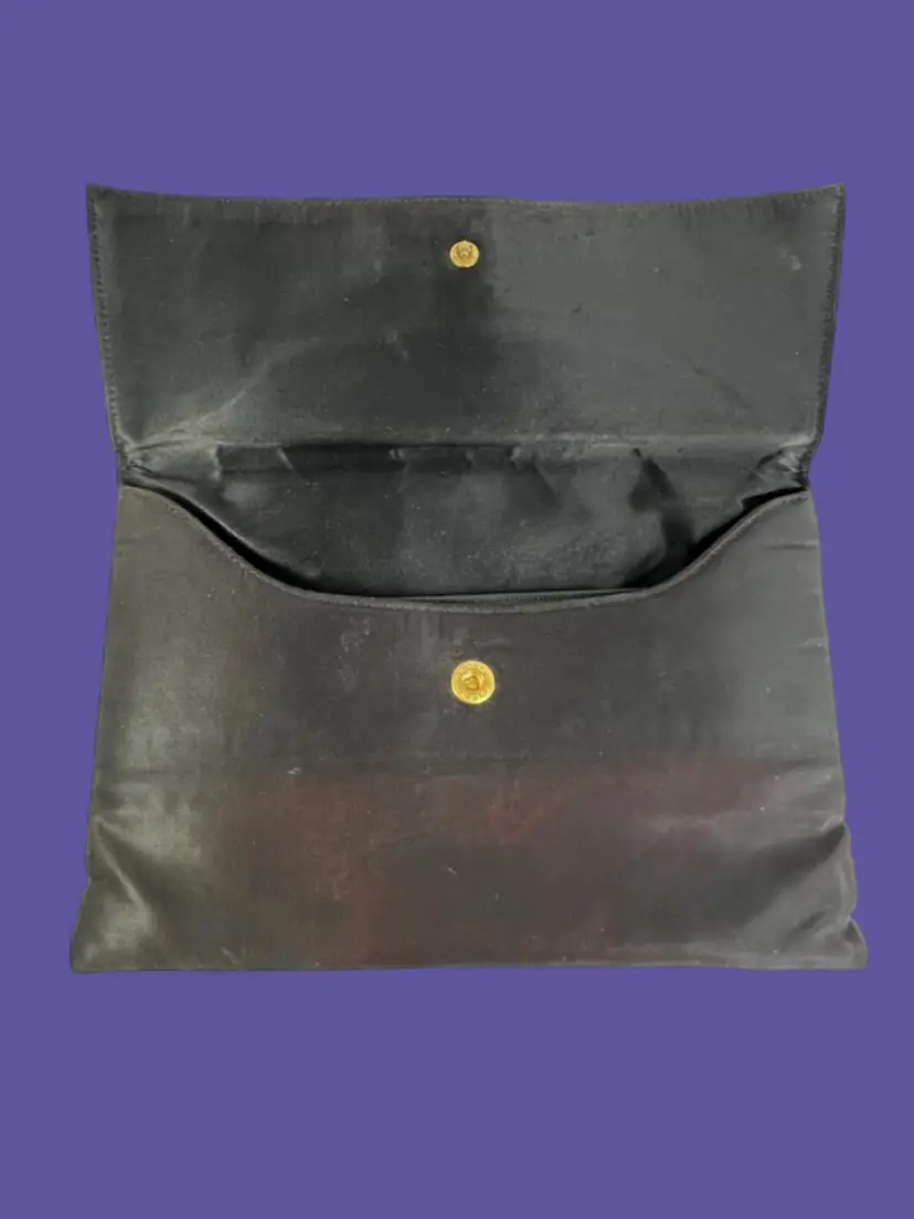 Vintage Ingber Black Satin Evening Clutch Purse Handbag. Bow with Rhinestone Bling. Includes a Silhouette Black Eyeglass Case. Ingber & Company was founded by brothers, Issac and David Ingber in 1903. It closed in 1966. 10” L x 6” H x 1” D Weighs 6 ounces Condition: Please see photos closeups. The rhinestone clip bottom needs reattached to purse. Rub wear in spots and edges. Back right top has a strange whitish semi-circle area.