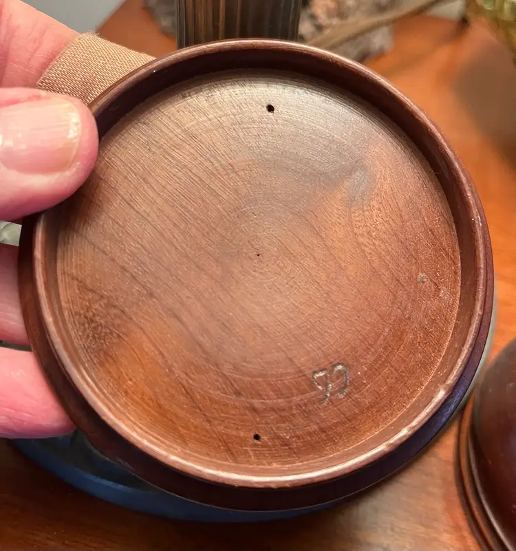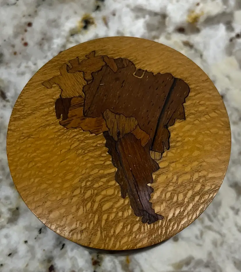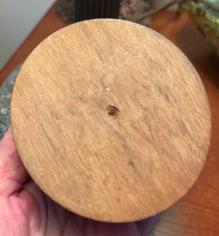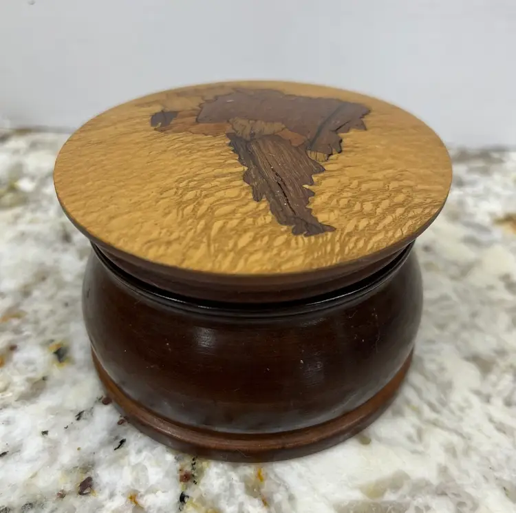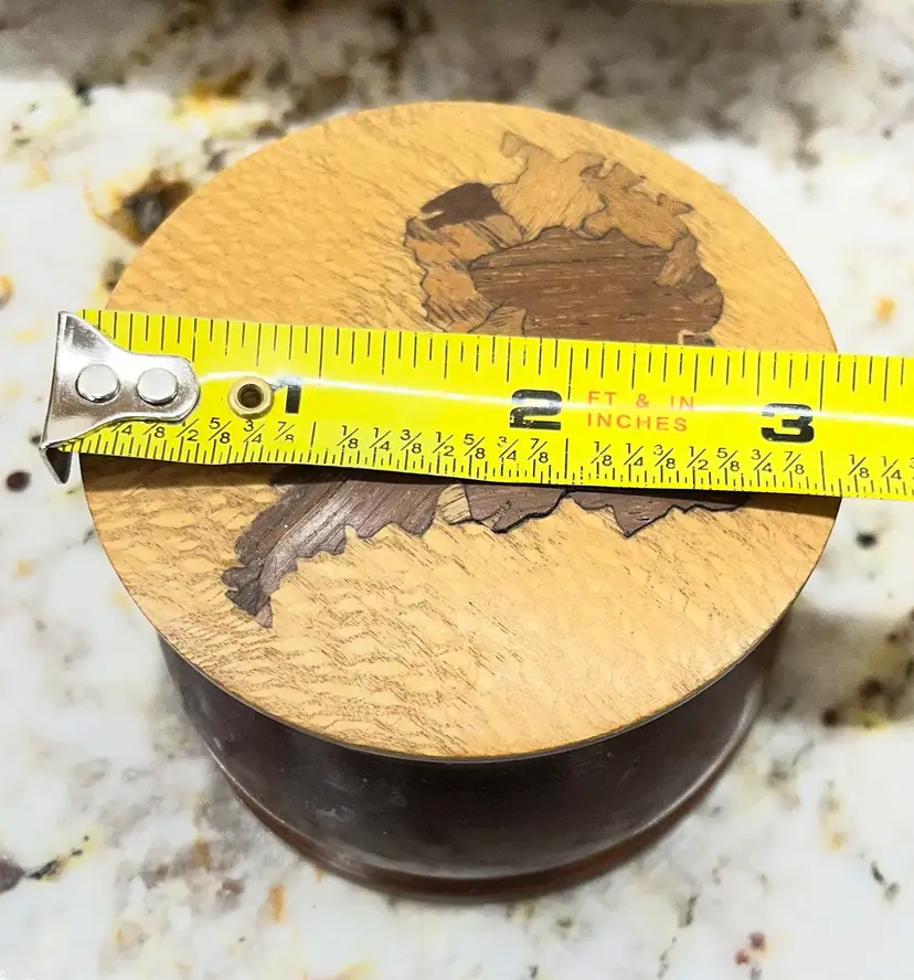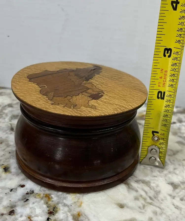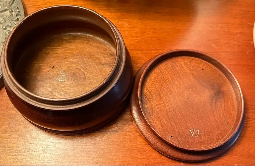 Handmade wooden trinket box. 3 1/8" Diameter by 2" H. Initials or numbers on inside of lid & box. Beautiful!