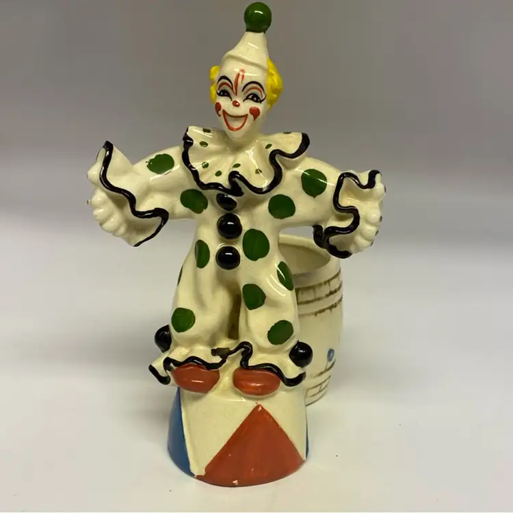 Clowns have a long history in entertainment, evolving from jesters to the iconic figures seen in circuses and popular culture. The mid-century ceramic versions often captured a whimsical, sometimes slightly eerie, aesthetic that appealed to collectors of kitsch and vintage decor. Their affordability and charming designs made them accessible collectibles for many households. 7” tall no chips or cracks.