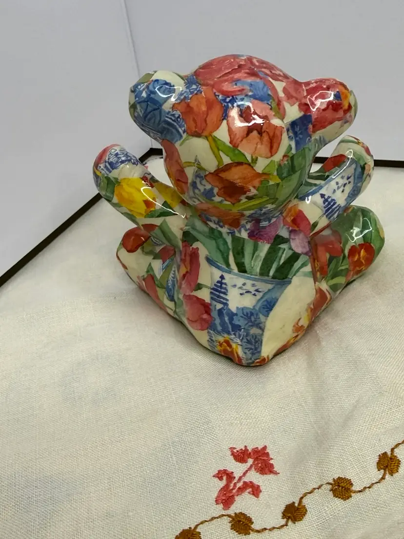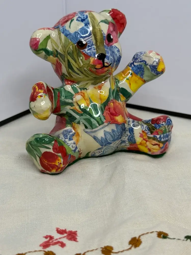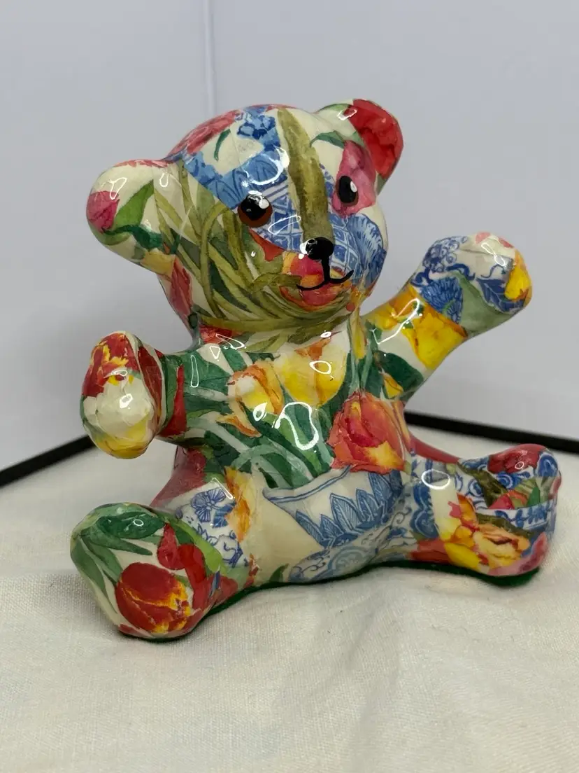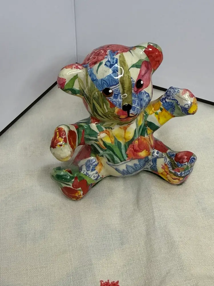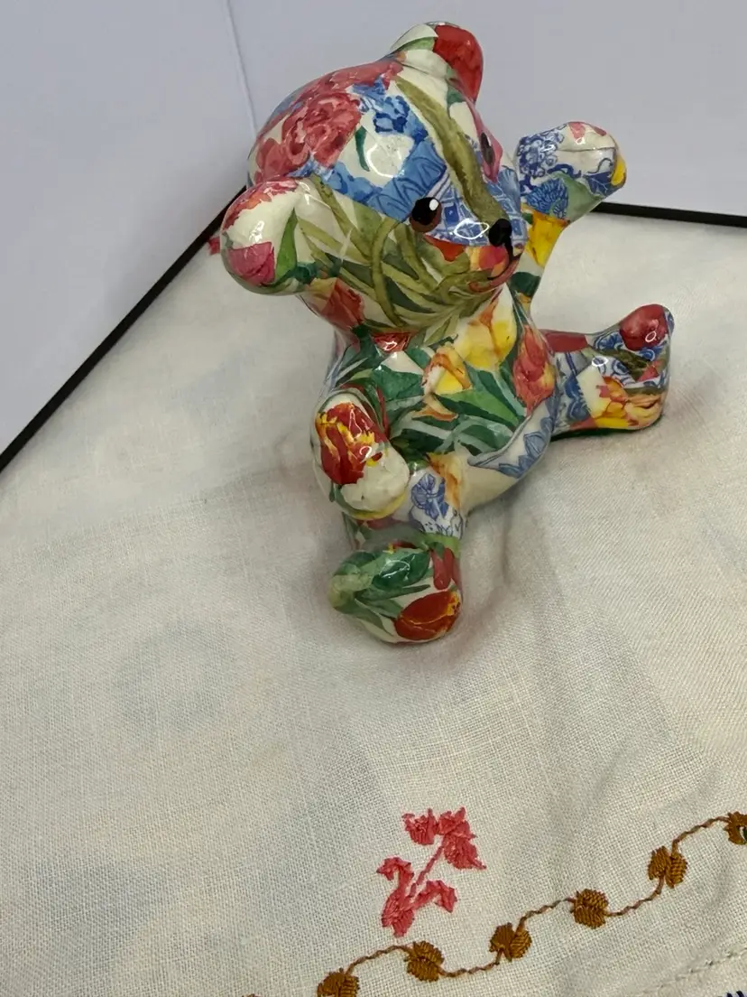 Vtg Joan Baker Designs Porcelain Patchworks Floral Print Fabric Bear Figurines. This teddy bear wins you over with her subtle face and her colorful decor. A perfect conversation piece to display on your favorite and most visible shelf.
