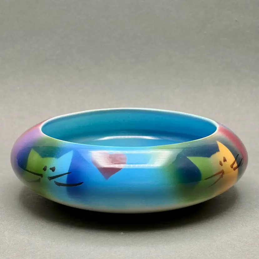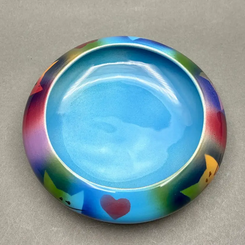 This delightful ceramic bowl by Judith Stiles matches the whimsical aesthetic of her vases, featuring airbrushed cat faces and hearts on a vibrant rainbow gradient. With a bright blue interior and low profile, it makes a perfect catch-all dish or candy bowl for an eclectic 1990’s-style home.