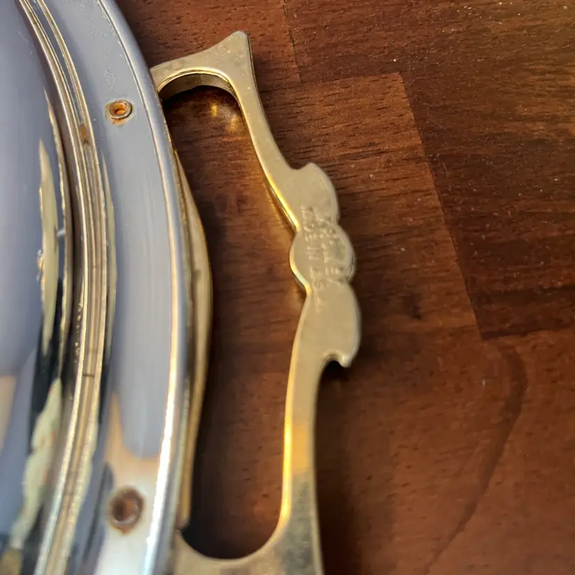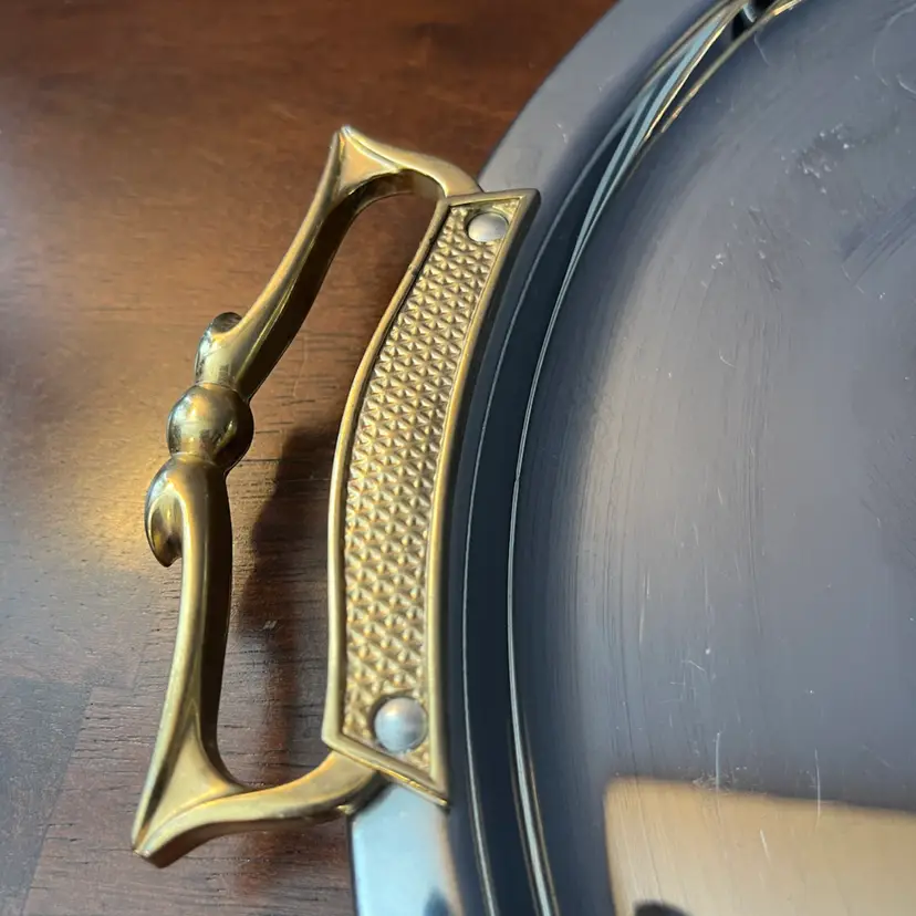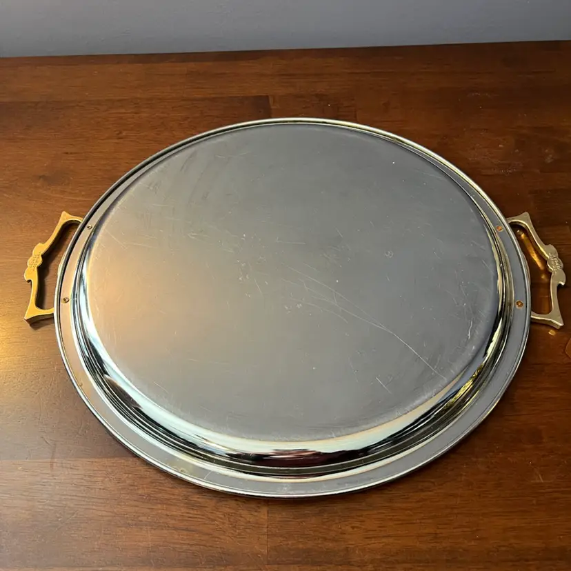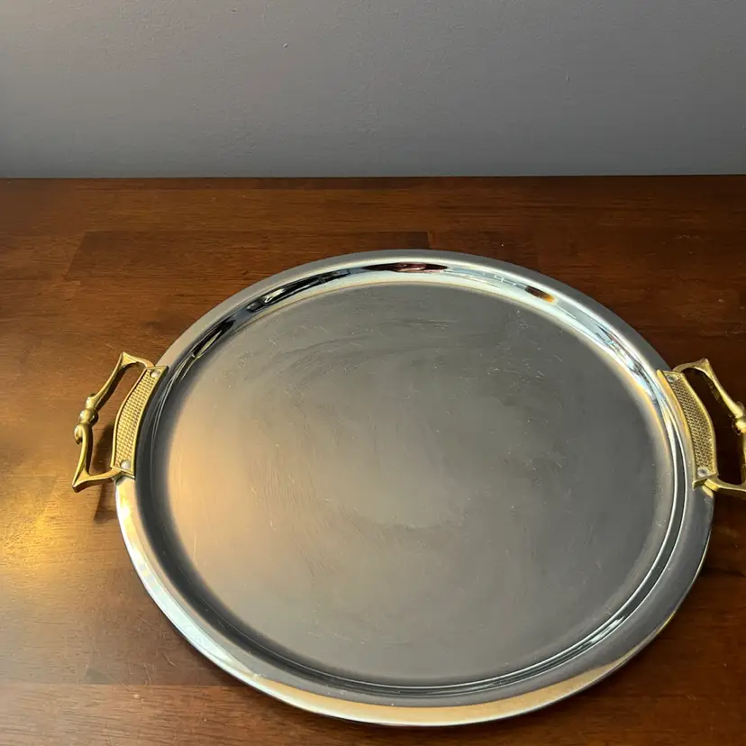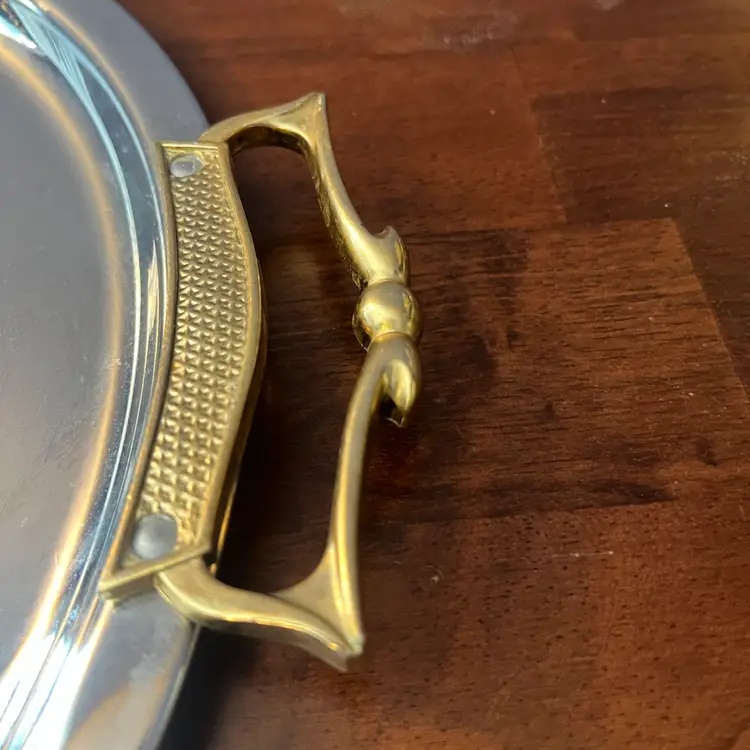 This type of serving tray, with its combination of polished chrome and decorative brass handles, is characteristic of Mid-Century Modern design. These pieces were often used for entertaining and added a touch of glamour to home decor during the 1950s and 1960s. They are sought after by collectors for their retro appeal and functional elegance.