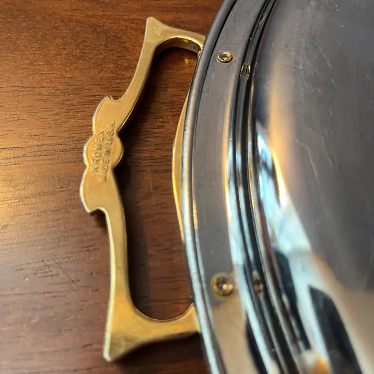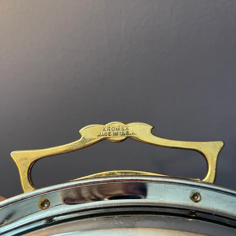 Kromex was a company known for producing decorative housewares, particularly during the mid-20th century. They specialized in chrome-plated items, often combined with other materials like brass or wood, to create stylish and functional serving pieces and decorative objects. Their products were popular in the post-war era, fitting well with the emerging Mid-Century Modern aesthetic.