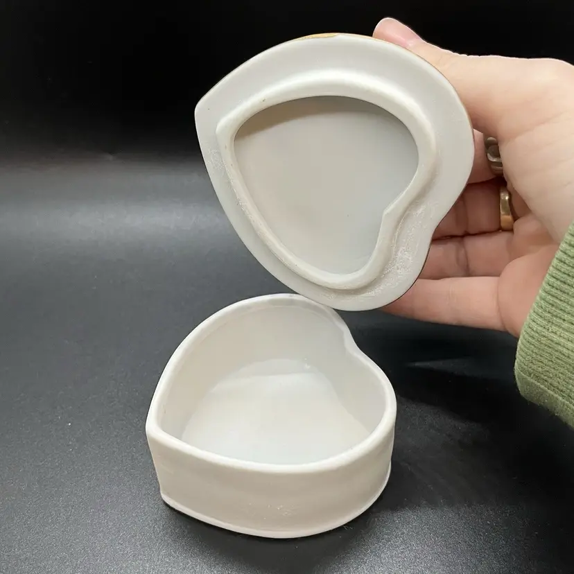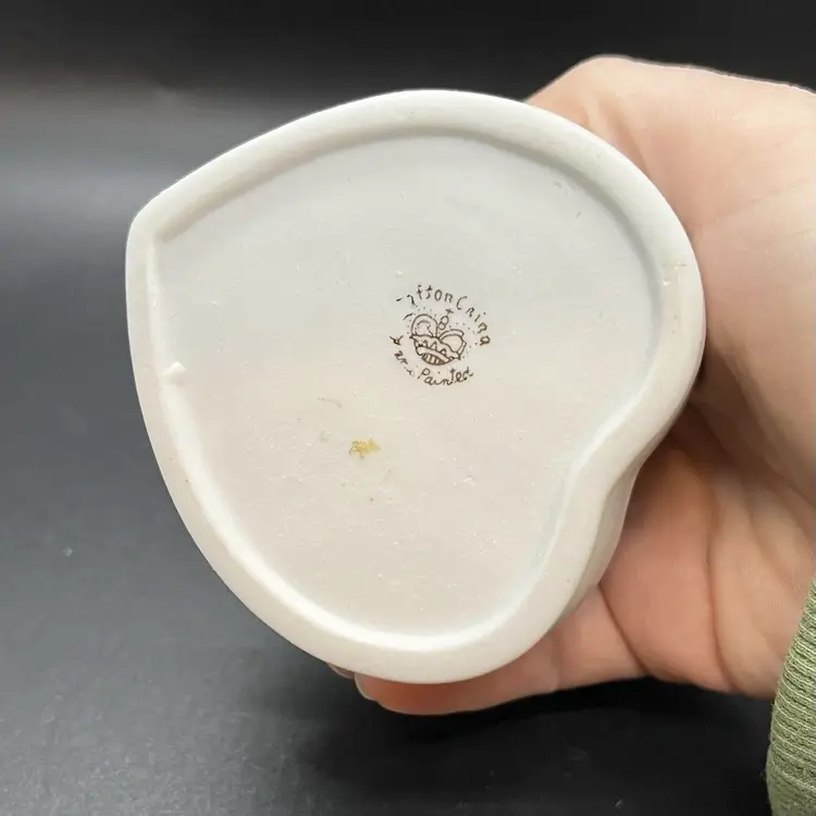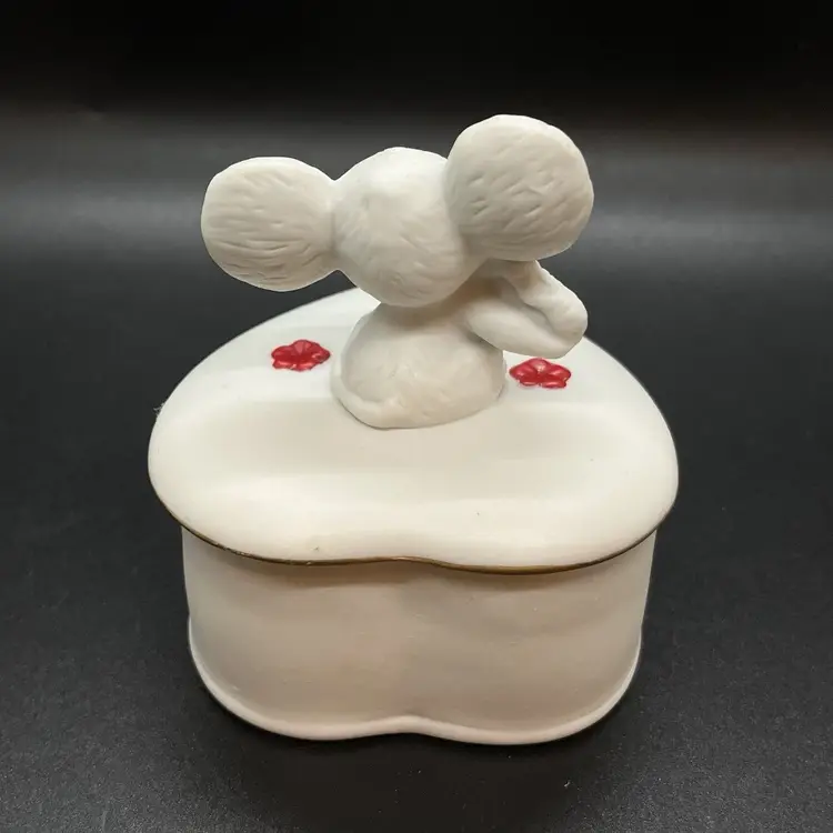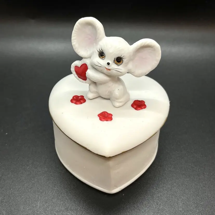 This is a heart shaped trinket box with a little mouse on top, made by Lefton. Has no chips or cracks, measures about 3" long and 3.5" tall.