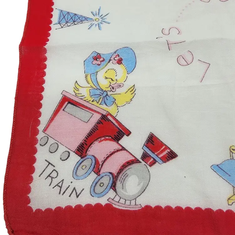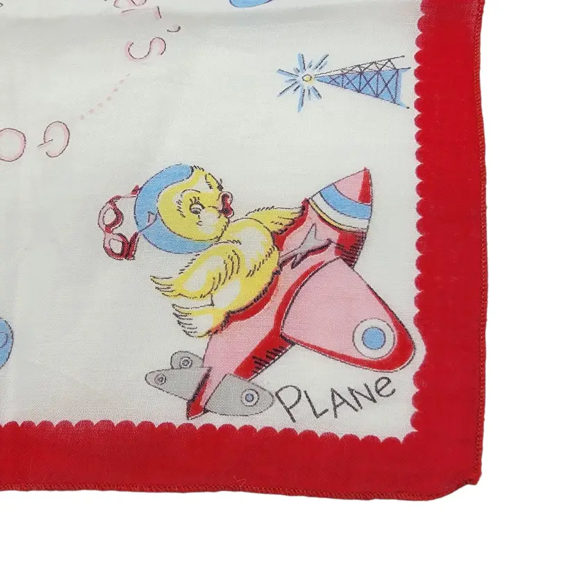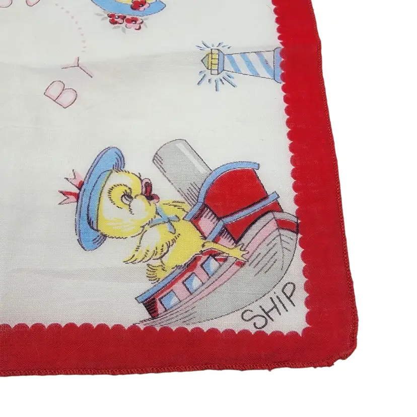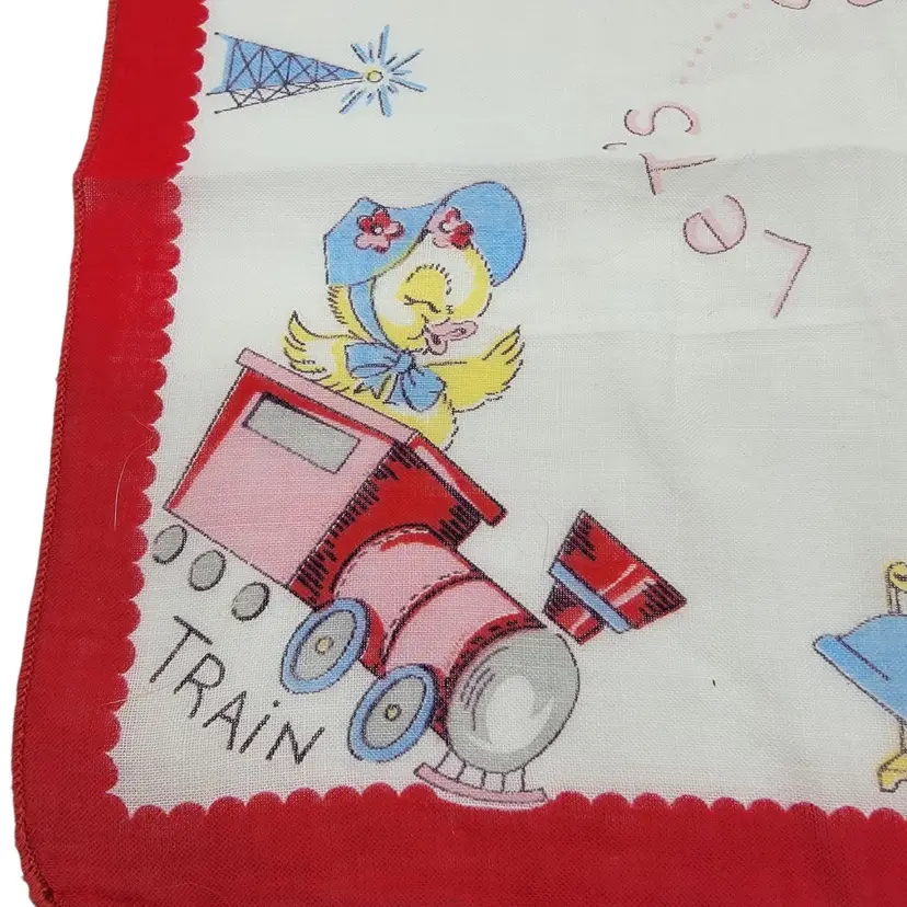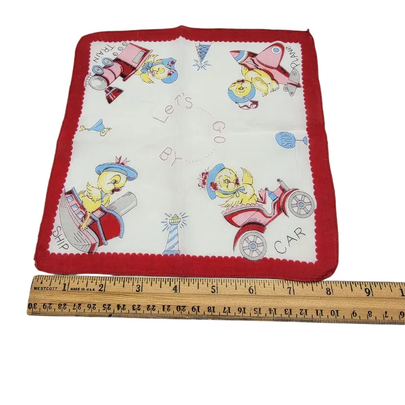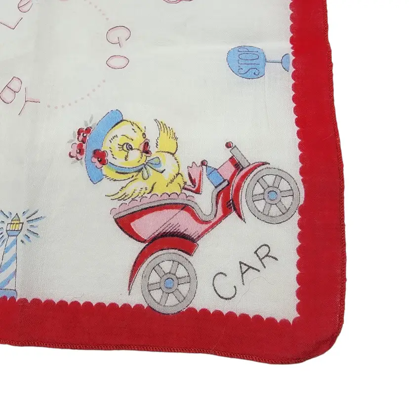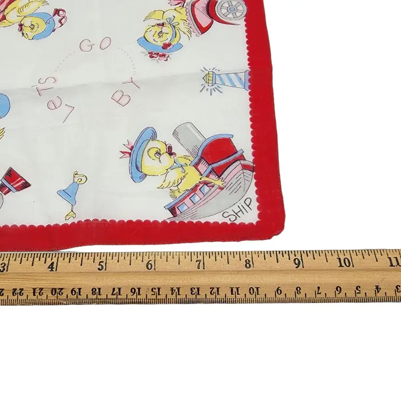 Vintage Lets Go By Children's Handkerchief With Red Trim Cute Chicks
