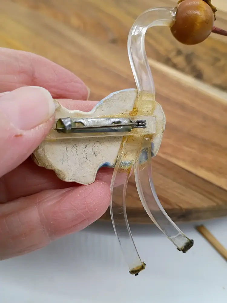 Vintage Lucite Acrylic and Wooden Kitschy Bird Ostrich Brooch 1950's. This is 3 inches tall and 3 inches long. This is preowned no chips cracks or flea bites on Lucite. Feathers and painted detail on wooden head intact. Beak intact. Marked faintly on back 1950. Pin back is secure and intact. Excellent condition. Ships USPS