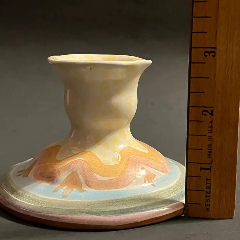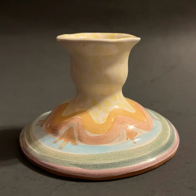 This petite Mackenzie Childs candlestick comes from the retired Brittany pattern, a line known for its soft pastels, hand‑painted detailing, and the gentle cottage charm that defined the company’s early ceramic work. Standing just 2¾ inches high, it is the small single‑light holder from the series, beautifully proportioned and ideal for layering into a tablescape, a vignette, or a curated collection of early MC pieces.