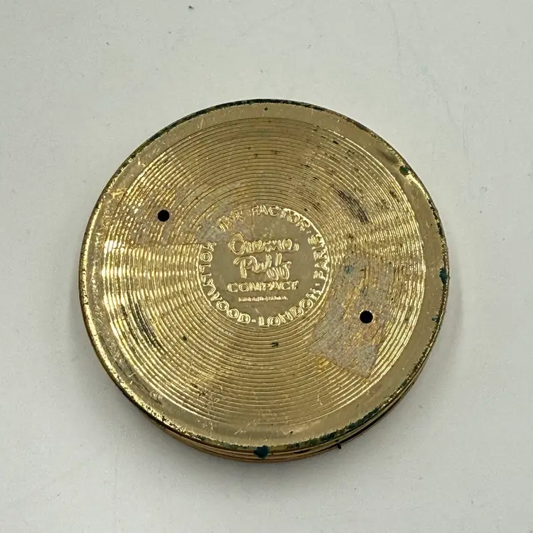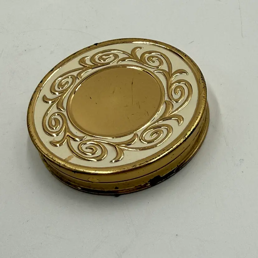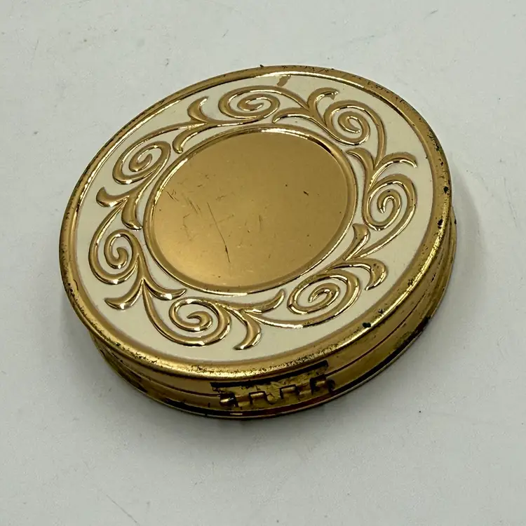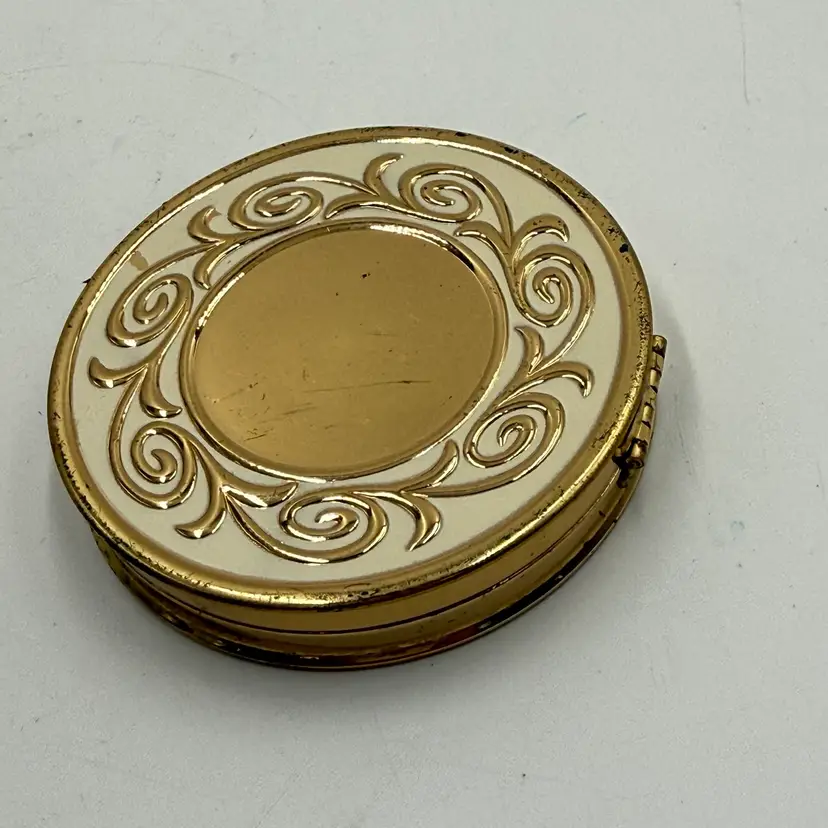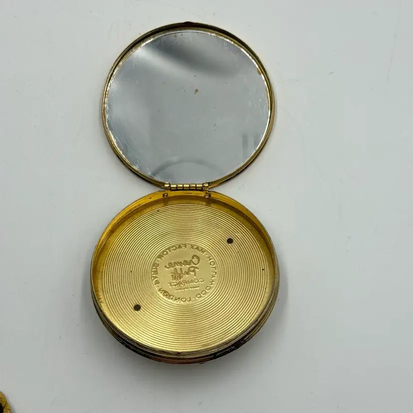 In fair condition. There is some wear on the gold tone and some desilvering on the mirror.