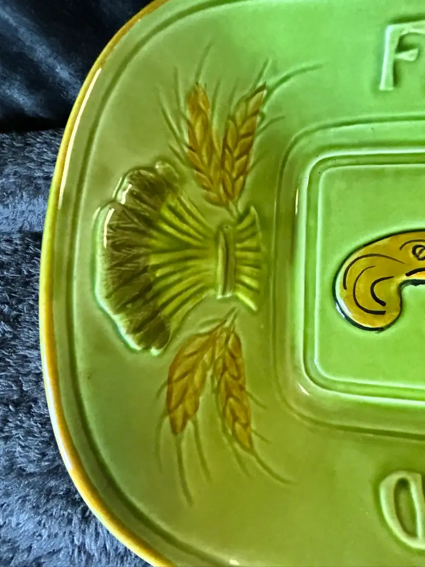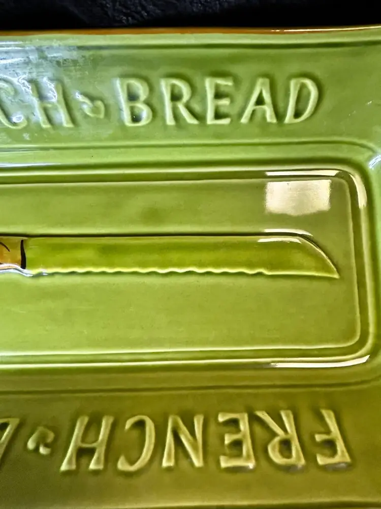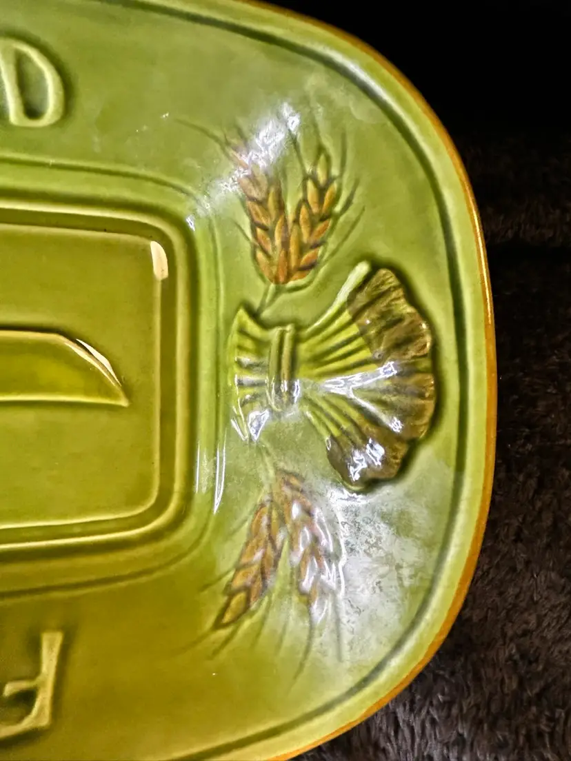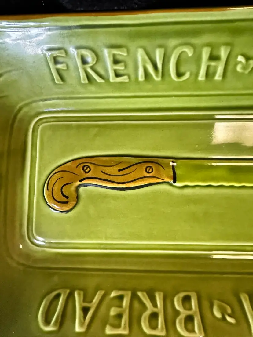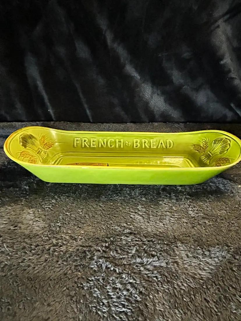 This is a vintage green ceramic French bread serving dish made by Los Angeles Potteries.