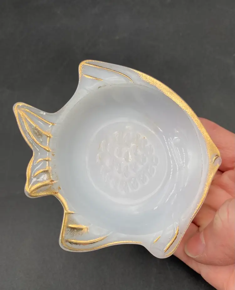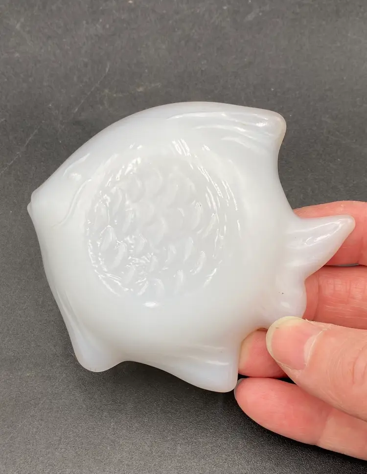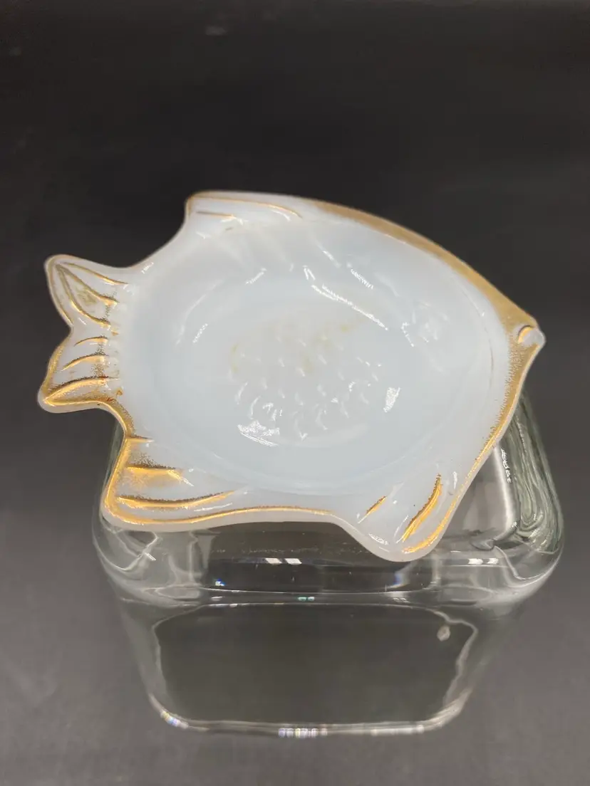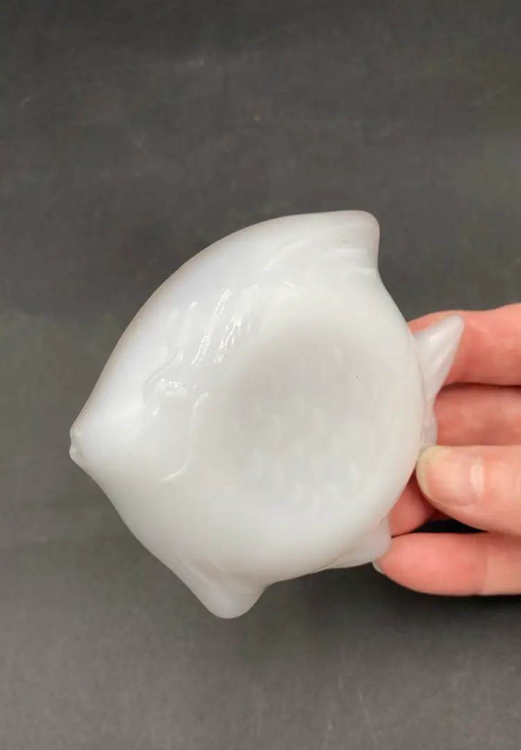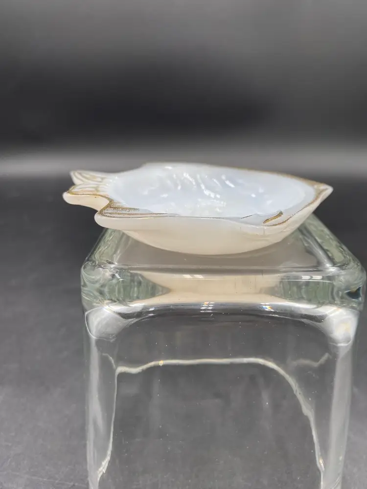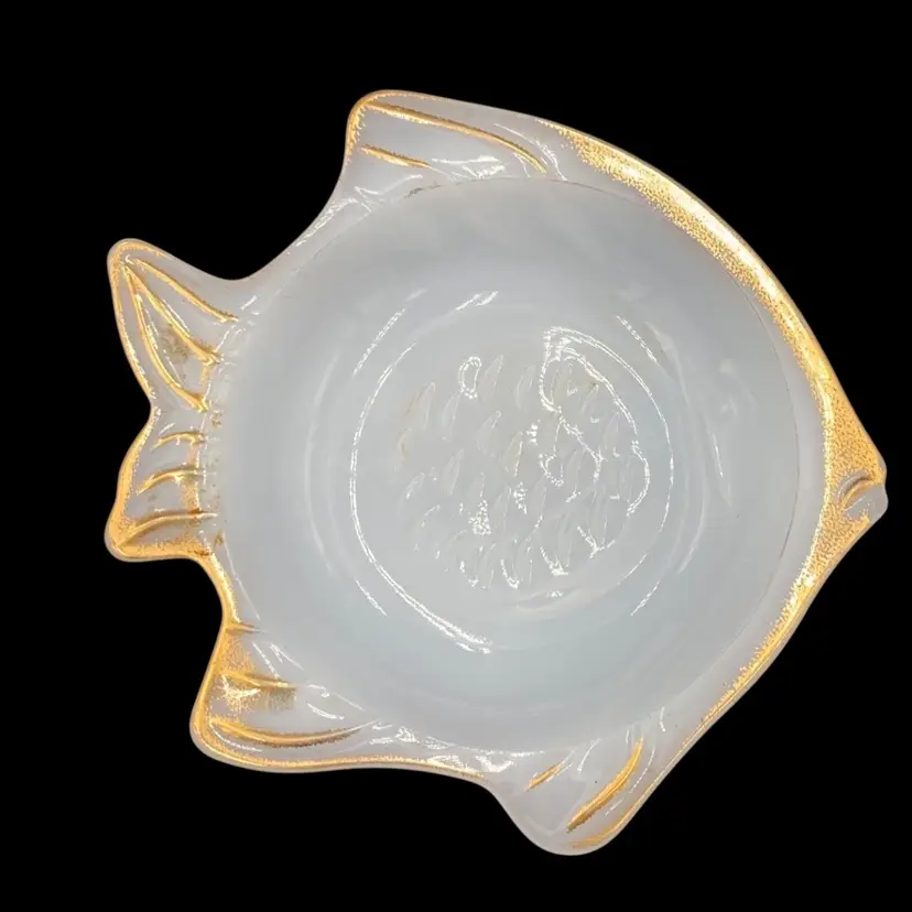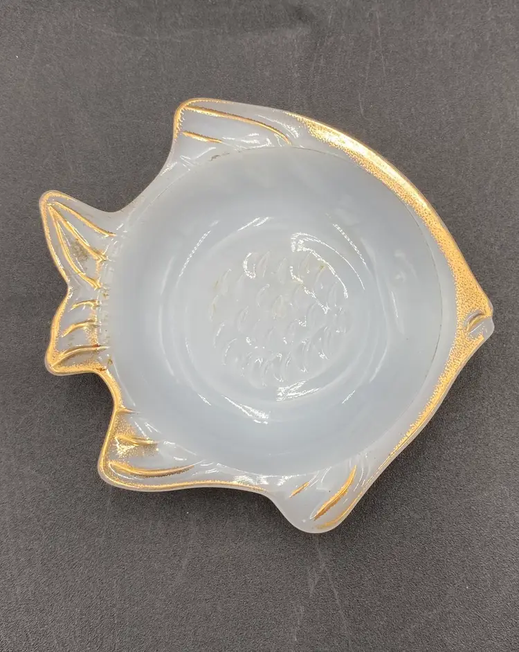 Add a unique touch to your collection with this vintage milk glass fish trinket dish. This plump little fish measures 3.75 inches in length, 3.5 inches in width and has a height of .5 inch. The white glass dish has embossed fish scales and eyes with gold detailing that complements its shape.
