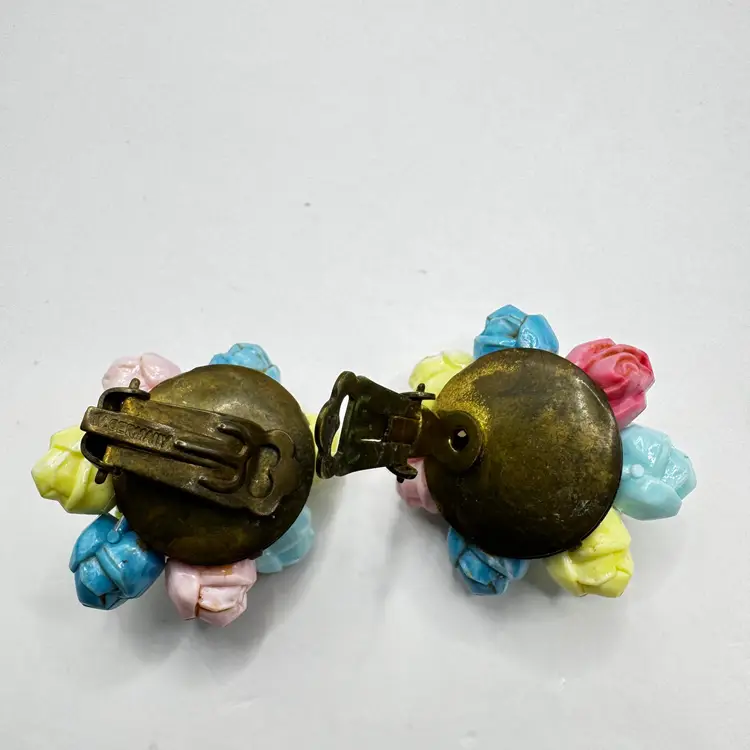 Vintage fantastic molded plastic flower cluster plaster spring bouquet antique brass clip earrings, stamped W. Germany. Excellent condition. Measures 1.25”. Weighs 2oz.