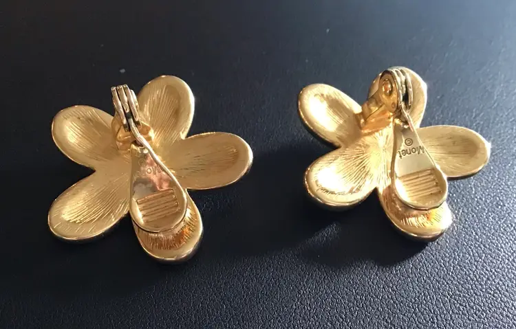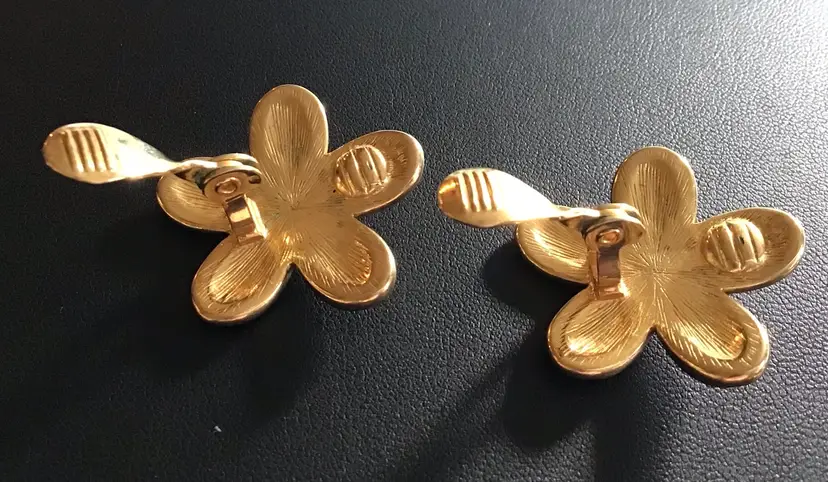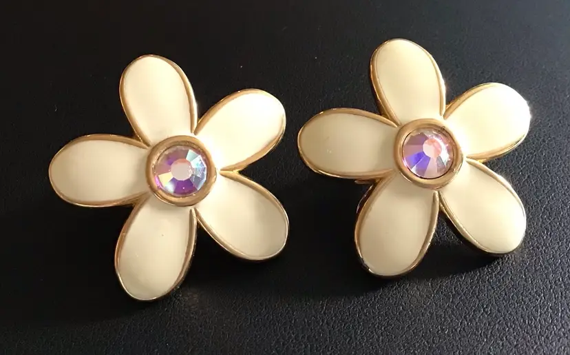 Large off white enamel daisy with rhinestone center, 1-1/4” adjustable clip ons. #688