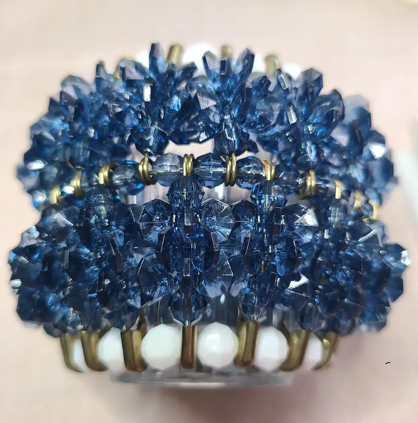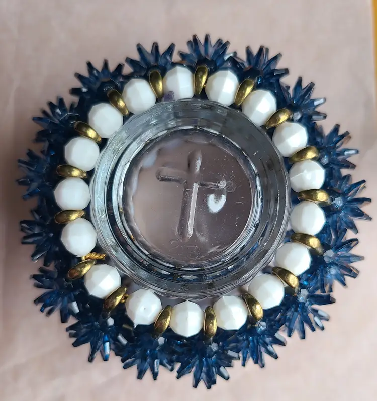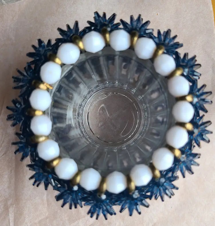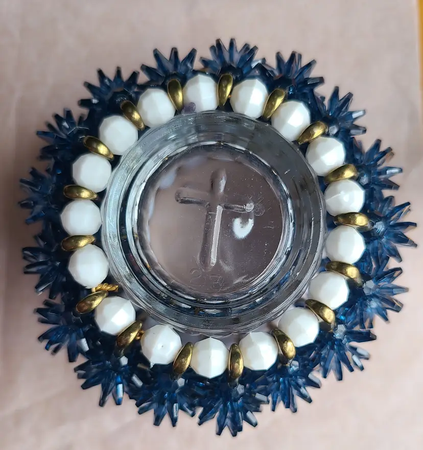 Lovely little hand-crafted candle holder. Height is approximately 2-3/4", width approximately 3-3/4".
