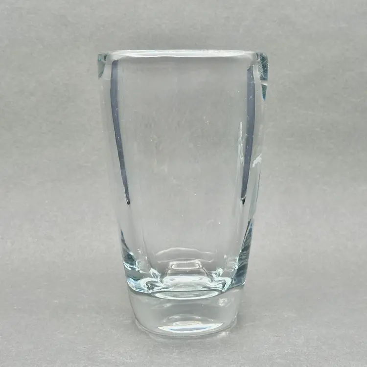 This exquisite vintage Orrefors crystal vase features a delicate copper-wheel engraving of a young girl playing the violin. Designed by Sven Palmqvist, this specific piece is signed with the code "P 2638," dating its production to approximately 1941–1942. It features a heavy, thick-walled square form that tapers elegantly to the base, creating a stunning contrast with the fine, airy detail of the etched motif. A beautiful example of early mid-century Swedish art glass.