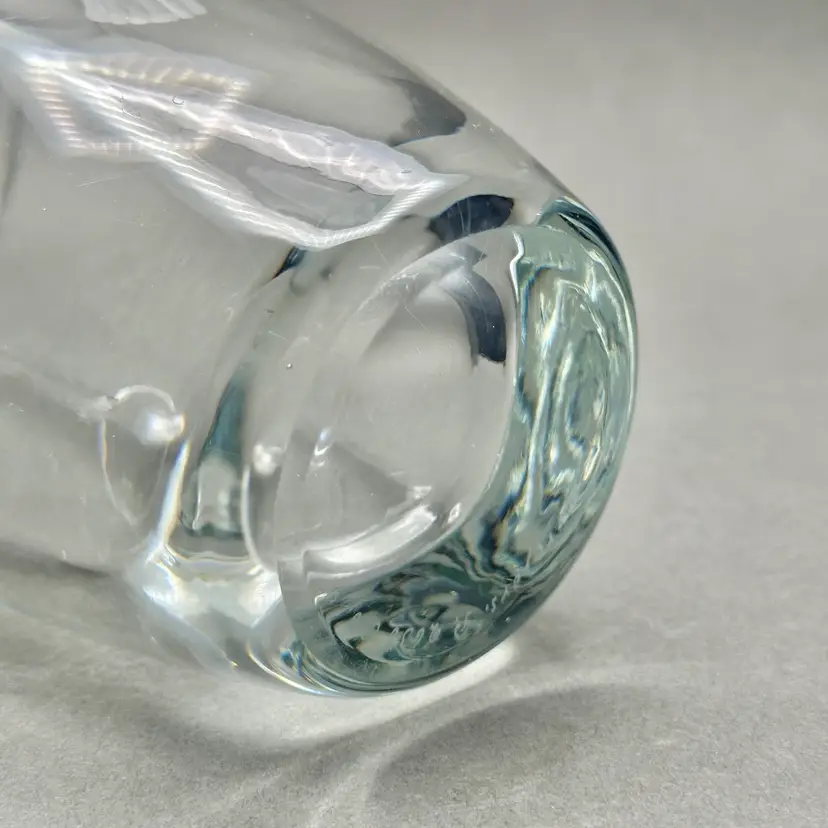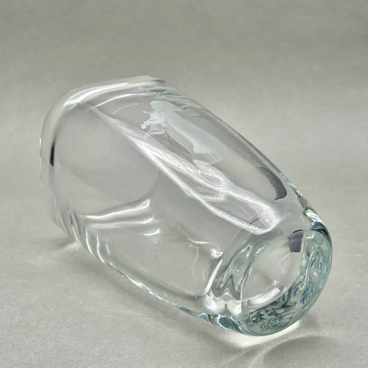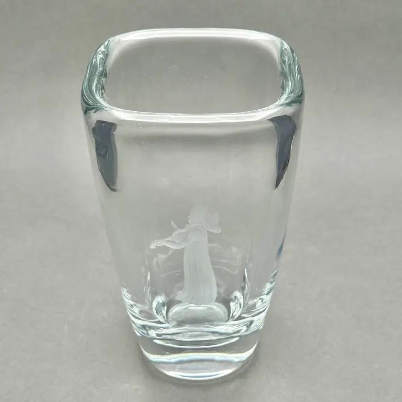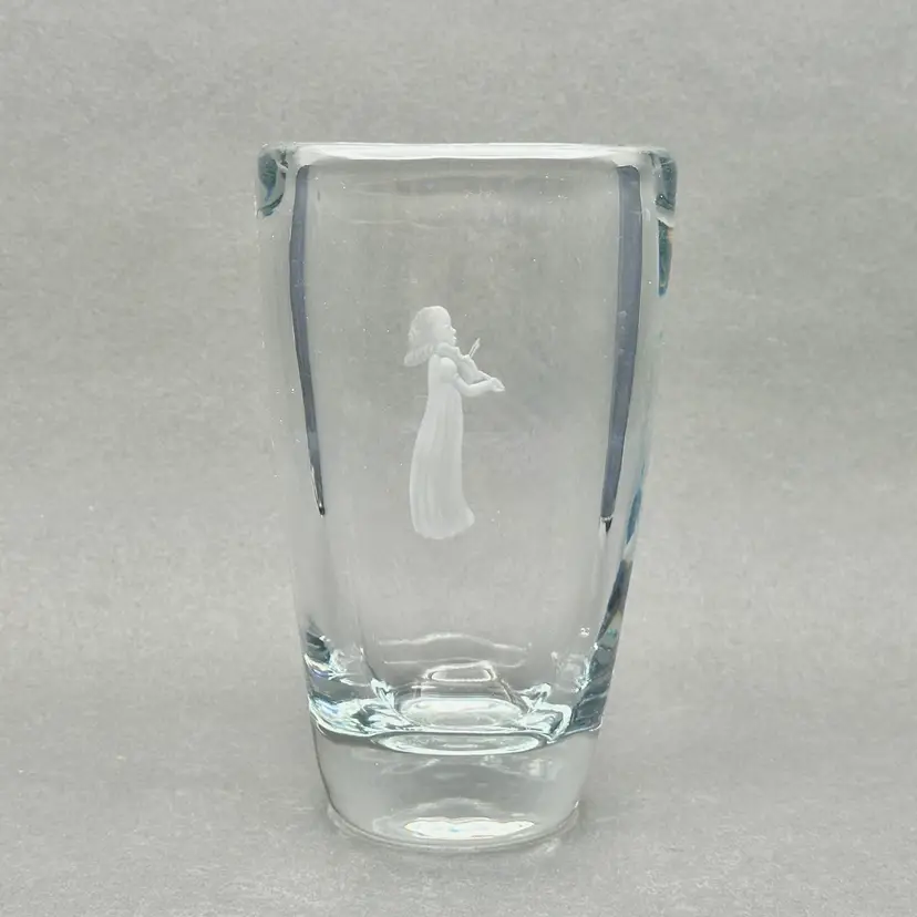 • Maker: Orrefors (Sweden) • Designer: Sven Palmqvist • Markings: Etched "Orrefors P 2638" on base • Date: Circa 1941–1942 • Material: Clear Crystal with Copper-Wheel Engraving • Dimensions: 7" tall x 4 1/4" square at top • Motif: Girl Playing Violin